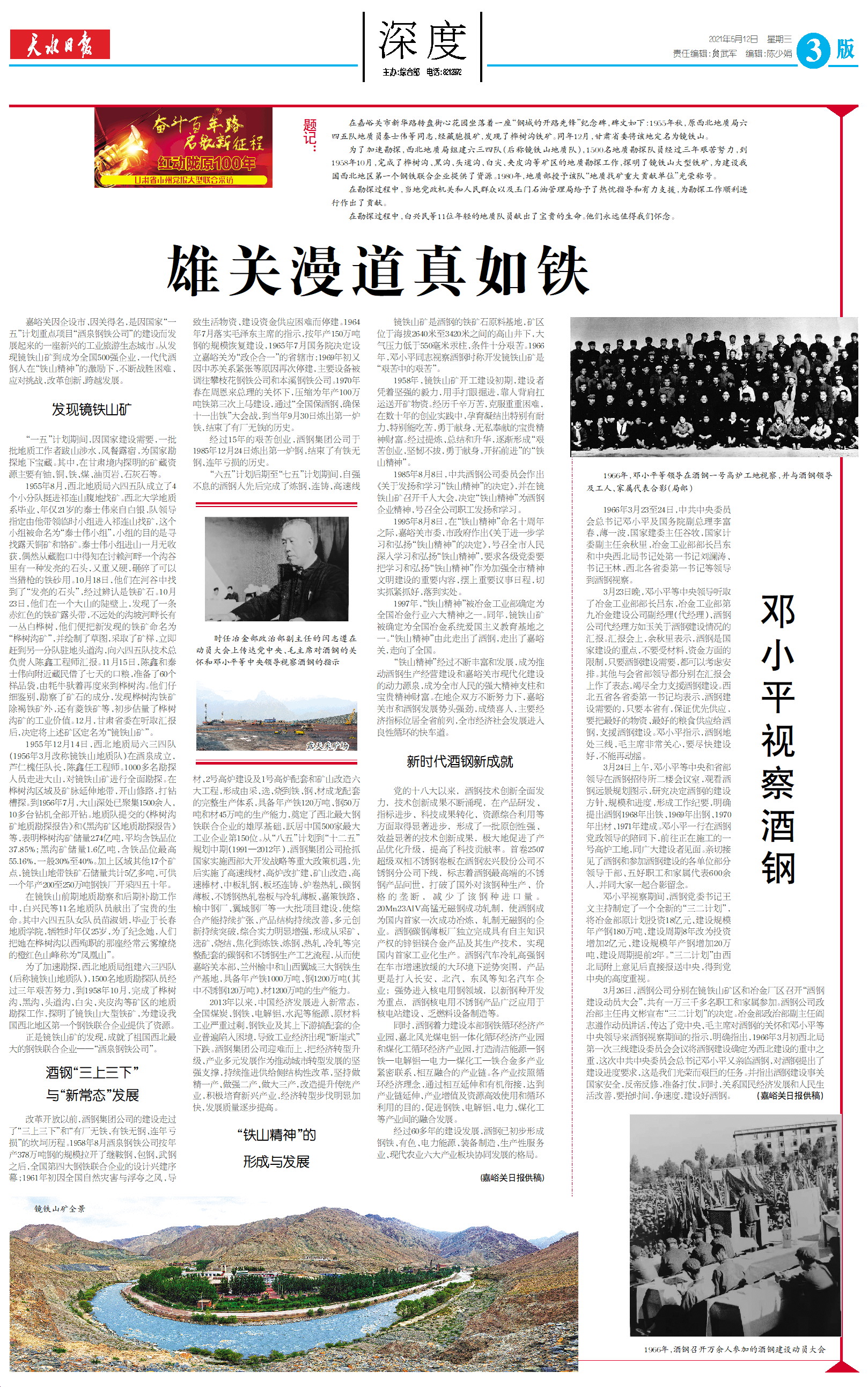 3月26日,酒钢公司分别在镜铁山矿区和冶金厂区召开“酒钢建设动员大会”,共有一万三千多名职工和家属参加。酒钢公司政治部主任冉文彬宣布“三二计划”的决定。冶金部政治部副主任阎志遵作动员讲话,传达了党中央、毛主席对酒钢的关怀和邓小平等中央领导来酒钢视察期间的指示,明确指出,1966年3月初西北局第一次三线建设委员会会议将酒钢建设确定为西北建设的重中之重,这次中共中央委员会总书记邓小平又亲临酒钢,对酒钢提出了建设进度要求,这是我们光荣而艰巨的任务。并指出酒钢建设事关国家安全,反帝反修,准备打仗,同时,关系国民经济发展和人民生活改善,要抢时间,争速度,建设好酒钢。 (嘉峪关日报供稿)