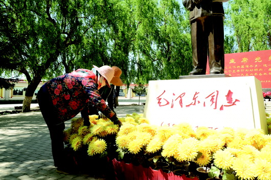 盛夏,走进银达村毛主席按语广场,绿树掩映,菊花簇拥着伟岸的毛主席铜像,身后红色的按语碑醒目耀眼。