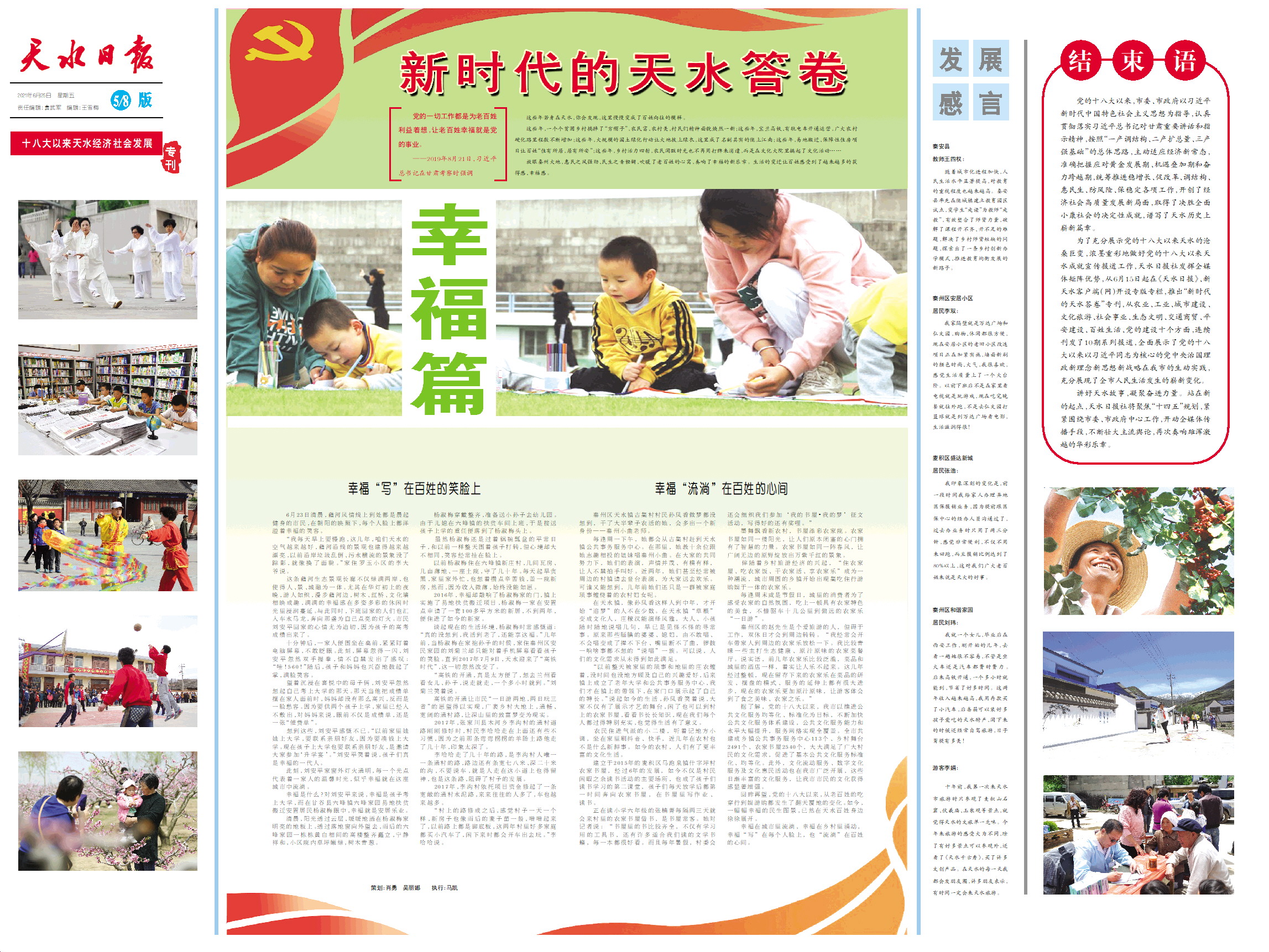 为了充分展示党的十八大以来天水的沧桑巨变,浓墨重彩地做好党的十八大以来天水成就宣传报道工作,天水日报社发挥全媒体矩阵优势,从6月15日起在《天水日报》、新天水客户端(网)开设专版专栏,推出“新时代的天水答卷”专刊,从农业、工业、城市建设、文化旅游、社会事业、生态文明、交通商贸、平安建设、百姓生活、党的建设十个方面,连续刊发了10期系列报道,全面展示了党的十八大以来以习近平同志为核心的党中央治国理政新理念新思想新战略在我市的生动实践,充分展现了全市人民生活发生的崭新变化。