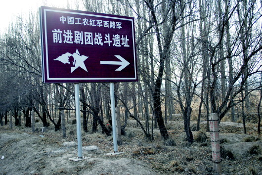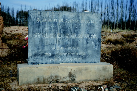 近日,记者来到永昌县东寨镇下三坝村,探访当年红西路军前进剧团的遗址。在初夏清晨的晨光中,看到马路边“中国工农红军西路军前进剧团战斗遗址”的指示牌和永昌县人民政府立下的遗址碑后,精神为之一振,感觉浑身热血沸腾。寂寞冷清的田野周围,仿佛幻化出当年红军将士为了理想血战马匪的战斗场面,军号声喊杀声马嘶声不绝如缕……