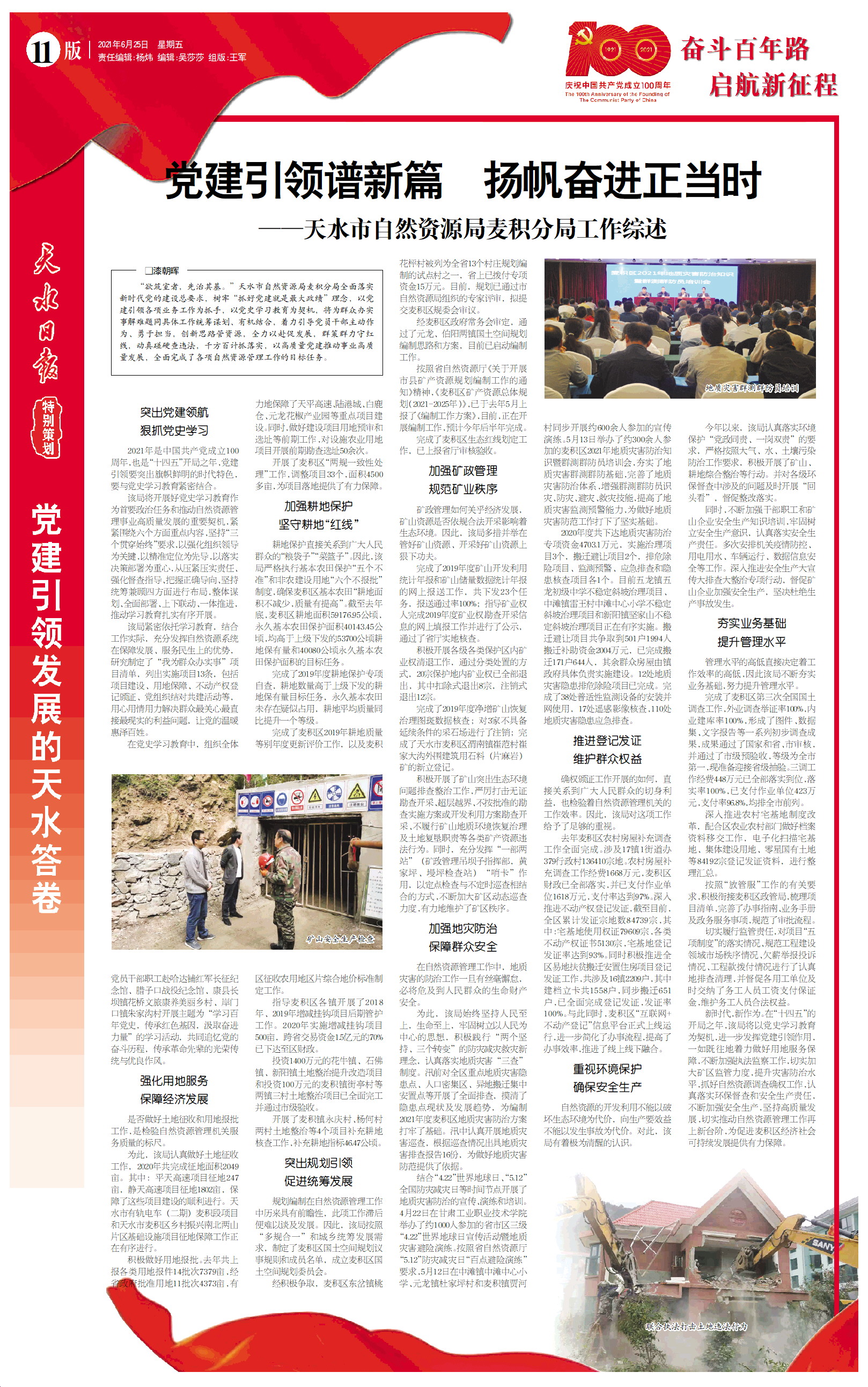 新时代,新作为。在“十四五”的开局之年,该局将以党史学习教育为契机,进一步发挥党建引领作用,一如既往地着力做好用地服务保障,不断加强执法监察工作,切实加大矿区监管力度,提升灾害防治水平,抓好自然资源调查确权工作,认真落实环保督查和安全生产责任,不断加强安全生产,坚持高质量发展,切实推动自然资源管理工作再上新台阶,为促进麦积区经济社会可持续发展提供有力保障。
