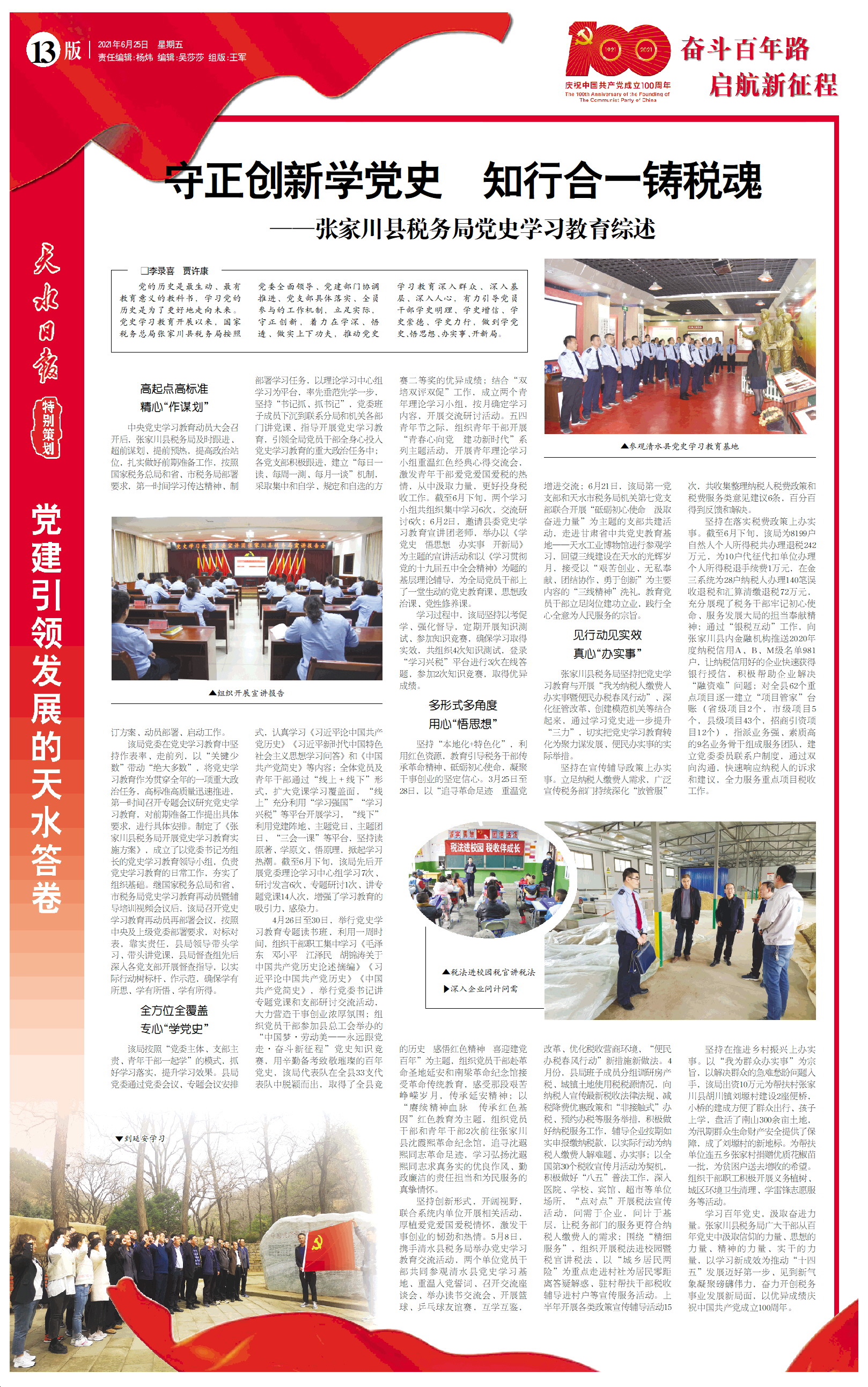 党的历史是最生动、最有教育意义的教科书,学习党的历史是为了更好地走向未来。党史学习教育开展以来,国家税务总局张家川县税务局按照党委全面领导、党建部门协调推进、党支部具体落实、全员参与的工作机制,立足实际,守正创新,着力在学深、悟透、做实上下功夫,推动党史学习教育深入群众、深入基层、深入人心,有力引导党员干部学史明理、学史增信、学史崇德、学史力行,做到学党史、悟思想、办实事、开新局。