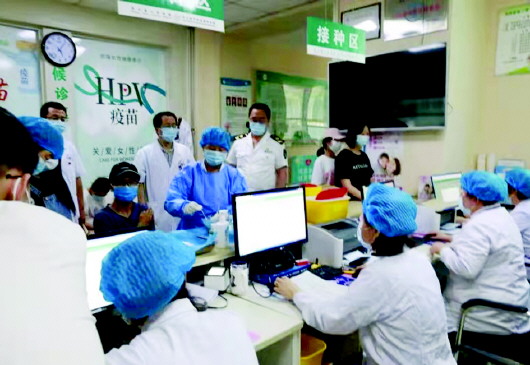 “注射疫苗后24小时内不要洗澡,避免感染,一周内应饮食清淡,不宜饮酒,不宜吃辛辣食物。”接种室内,每个接种台配备两名护士,一名护士仔细查看受种者预检信息确定该人员是否符合接种条件。另一名护士熟练地注射疫苗、告知已接种人员饮食禁忌和注意事项。