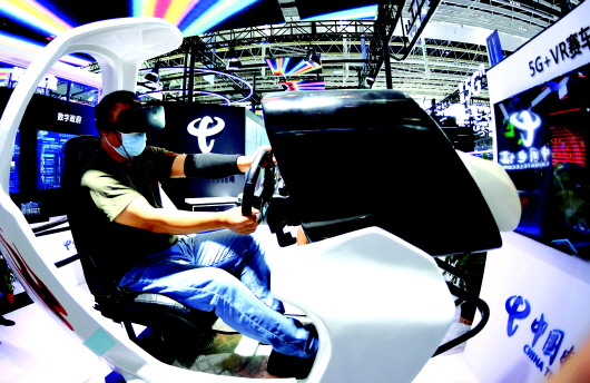 9月7日,参观者在体验5G+VR赛车。2021中国国际数字经济博览会于9月6日至8日在河北石家庄举行,共有468家企业参展,汇聚了国内外数字经济领域众多知名企业,一批“黑科技”成果集中亮相。 新华社记者 王晓 摄