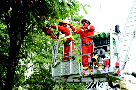 10月10日,受降雪影响,清水县部分供电线路短路,导致大区域供电中断。清水消防救援大队出动两辆车10名消防队员赶赴现场协助供电公司清除树木树枝等障碍物,为线路抢修打通处置通道。 魏珊珊 摄