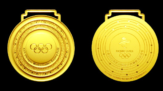10月26日,2022年北京冬奥会和冬残奥会奖牌在北京发布。图为北京冬奥会金牌正面(左)与背面。新华社发(北京冬奥组委供图)