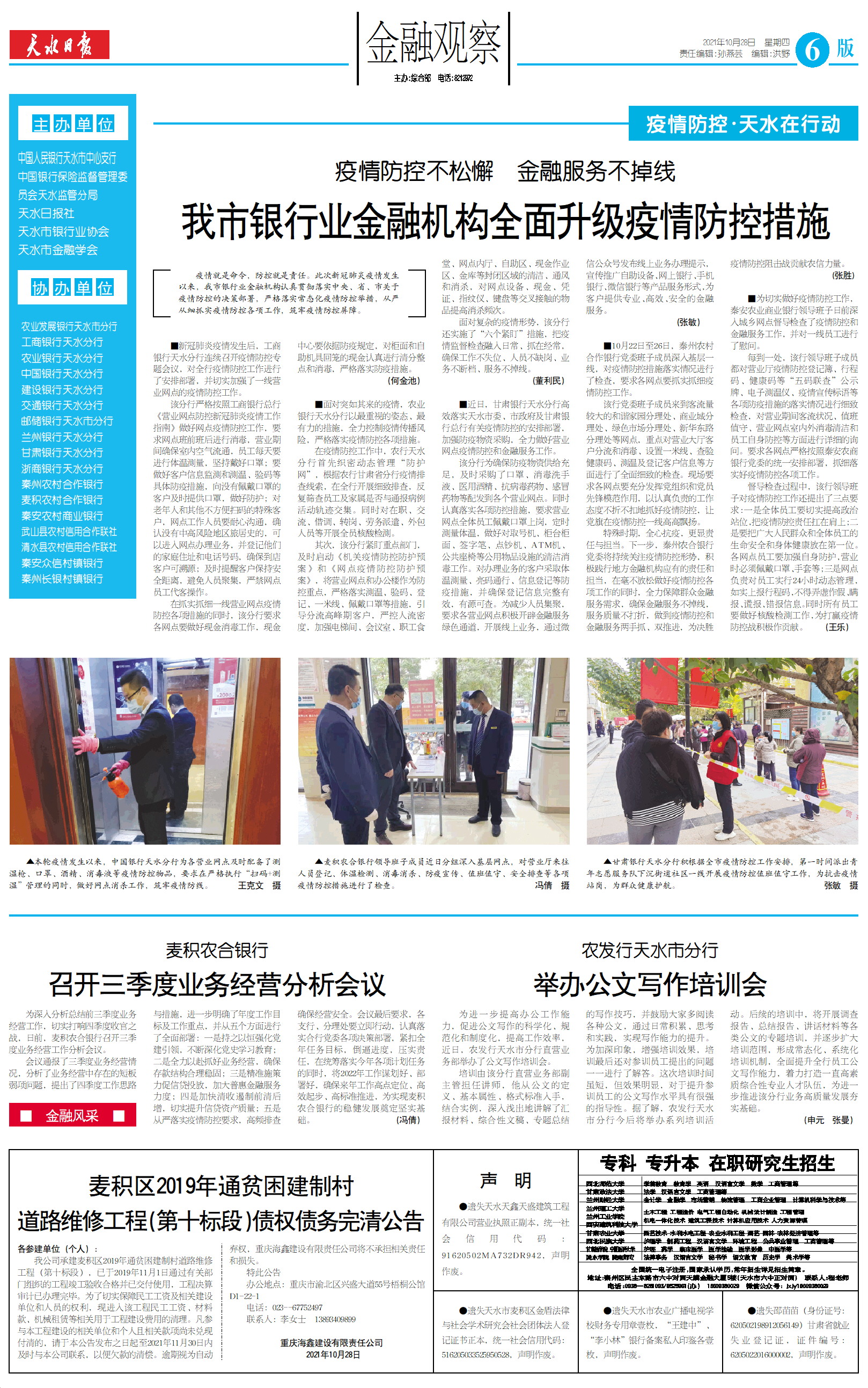 疫情就是命令,防控就是责任。此次新冠肺炎疫情发生以来,我市银行业金融机构认真贯彻落实中央、省、市关于疫情防控的决策部署,严格落实常态化疫情防控举措,从严从细抓实疫情防控各项工作,筑牢疫情防控屏障。 ■新冠肺炎疫情发生后,工商银行天水分行连续召开疫情防控专题会议,对全行疫情防控工作进行了安排部署,并切实加强了一线营业网点的疫情防控工作。 该分行严格按照工商银行总行《营业网点防控新冠肺炎疫情工作指南》做好网点疫情防控工作,要求网点班前班后进行消毒,营业期间确保室内空气流通,员工每天要进行体温测量,坚持戴好口罩;要做好客户信息监测和测温、验码等具体防疫措施,向没有佩戴口罩的客户及时提供口罩,做好防护;对老年人和其他不方便扫码的特殊客户,网点工作人员要耐心沟通,确认没有中高风险地区旅居史的,可以进入网点办理业务,并登记他们的家庭住址和电话号码,确保到店客户可溯源;及时提醒客户保持安全距离,避免人员聚集,严禁网点员工代客操作。 在抓实抓细一线营业网点疫情防控各项措施的同时,该分行要求各网点要做好现金消毒工作,现金中心要依据防疫规定,对柜面和自助机具回笼的现金认真进行清分整点和消毒,严格落实防疫措施。 (何金池) ■面对突如其来的疫情,农业银行天水分行以最重视的姿态、最有力的措施,全力控制疫情传播风险,严格落实疫情防控各项措施。 在疫情防控工作中,农行天水分行首先织密动态管理“防护网”,根据农行甘肃省分行疫情排查线索,在全行开展细致排查,反复筛查员工及家属是否与通报病例活动轨迹交集。同时对在职、交流、借调、转岗、劳务派遣、外包人员等开展全员核酸检测。 其次,该分行紧盯重点部门,及时启动《机关疫情防控防护预案》和《网点疫情防控防护预案》,将营业网点和办公楼作为防控重点,严格落实测温、验码、登记、一米线、佩戴口罩等措施,引导分流高峰期客户,严控人流密度,加强电梯间、会议室、职工食堂、网点内厅、自助区、现金作业区、金库等封闭区域的清洁、通风和消杀,对网点设备、现金、凭证、指纹仪、键盘等交叉接触的物品提高消杀频次。 面对复杂的疫情形势,该分行还实施了“六个紧盯”措施,把疫情监督检查融入日常、抓在经常,确保工作不失位、人员不缺岗、业务不断档、服务不掉线。 (董利民) ■近日,甘肃银行天水分行高效落实天水市委、市政府及甘肃银行总行有关疫情防控的安排部署,加强防疫物资采购,全力做好营业网点疫情防控和金融服务工作。 该分行为确保防疫物资供给充足,及时采购了口罩、消毒洗手液、医用酒精、抗病毒药物、感冒药物等配发到各个营业网点。同时认真落实各项防控措施,要求营业网点全体员工佩戴口罩上岗,定时测量体温,做好对取号机、柜台柜面、签字笔、点钞机、ATM机、公共座椅等公用物品设施的清洁消毒工作。对办理业务的客户采取体温测量、亮码通行、信息登记等防疫措施,并确保登记信息完整有效,有源可查。为减少人员集聚,要求各营业网点积极开辟金融服务绿色通道,开展线上业务,通过微信公众号发布线上业务办理提示,宣传推广自助设备、网上银行、手机银行、微信银行等产品服务形式,为客户提供专业、高效、安全的金融服务。 (张敏) ■10月22日至26日,秦州农村合作银行党委班子成员深入基层一线,对疫情防控措施落实情况进行了检查,要求各网点要抓实抓细疫情防控工作。 该行党委班子成员来到客流量较大的和谐家园分理处、商业城分理处、绿色市场分理处、新华东路分理处等网点,重点对营业大厅客户分流和消毒、设置一米线、查验健康码、测温及登记客户信息等方面进行了全面细致的检查。现场要求各网点要充分发挥党组织和党员先锋模范作用,以认真负责的工作态度不折不扣地抓好疫情防控,让党旗在疫情防控一线高高飘扬。 特殊时期,全心抗疫,更显责任与担当。下一步,秦州农合银行党委将持续关注疫情防控形势,积极践行地方金融机构应有的责任和担当,在毫不放松做好疫情防控各项工作的同时,全力保障群众金融服务需求,确保金融服务不掉线,服务质量不打折,做到疫情防控和金融服务两手抓、双推进,为决胜疫情防控阻击战贡献农信力量。 (张胜) ■为切实做好疫情防控工作,秦安农业商业银行领导班子日前深入城乡网点督导检查了疫情防控和金融服务工作,并对一线员工进行了慰问。 每到一处,该行领导班子成员都对营业厅疫情防控登记簿、行程码、健康码等“五码联查”公示牌、电子测温仪、疫情宣传标语等各项防疫措施的落实情况进行细致检查,对营业期间客流状况、值班值守、营业网点室内外消毒清洁和员工自身防控等方面进行详细的询问。要求各网点严格按照秦安农商银行党委的统一安排部署,抓细落实好疫情防控各项工作。 督导检查过程中,该行领导班子对疫情防控工作还提出了三点要求:一是全体员工要切实提高政治站位,把疫情防控责任扛在肩上;二是要把广大人民群众和全体员工的生命安全和身体健康放在第一位。各网点员工要加强自身防护,营业时必须佩戴口罩、手套等;三是网点负责对员工实行24小时动态管理,如实上报行程码,不得弄虚作假、瞒报、谎报、错报信息。同时所有员工要做好核酸检