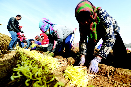 12月15日,在兰州市西固区张家大坪村,农民在整理韭黄。