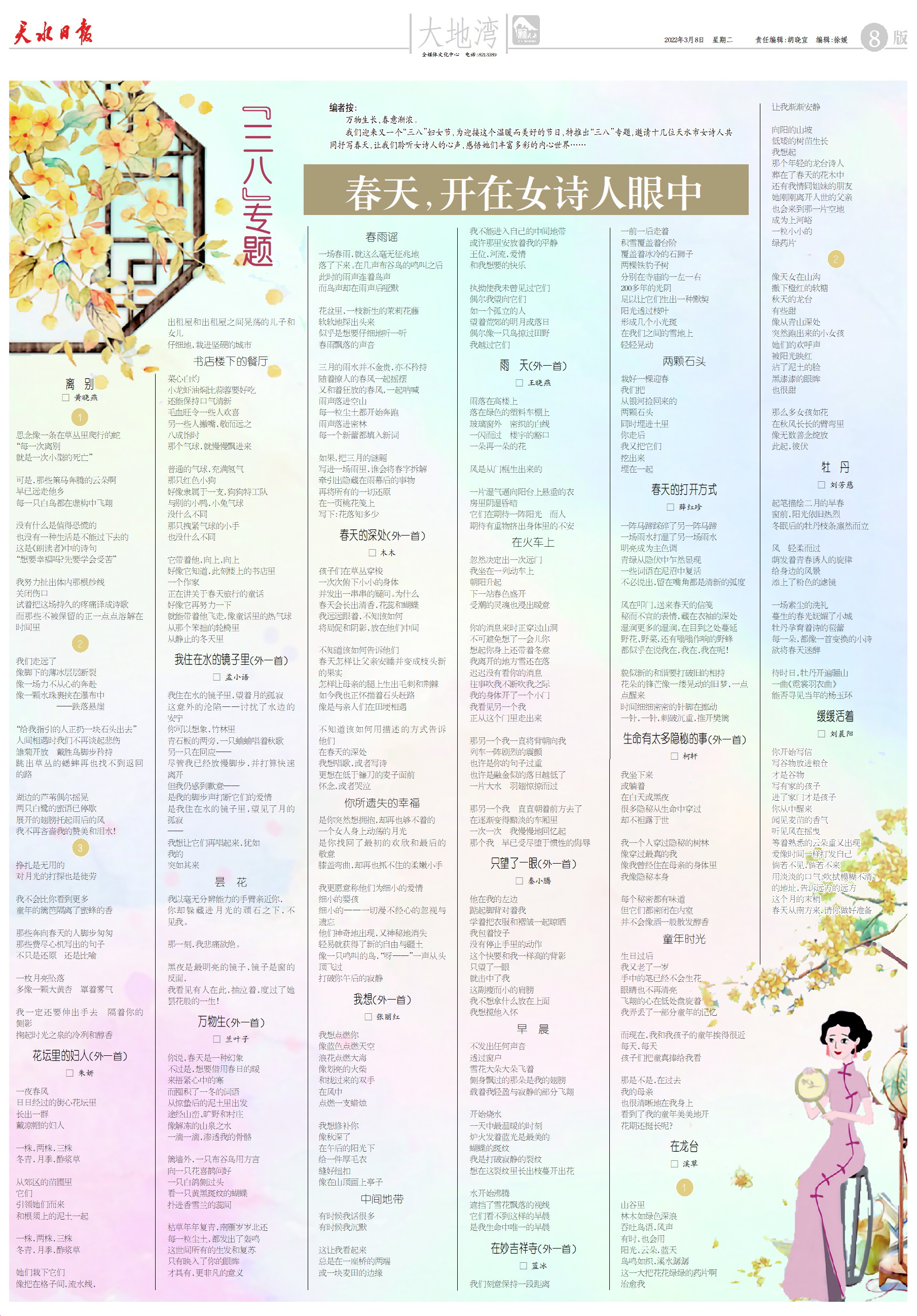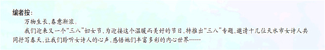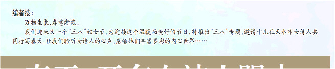 我们迎来又一个“三八”妇女节,为迎接这个温暖而美好的节日,特推出“三八”专题,邀请十几位天水市女诗人共同抒写春天,让我们聆听女诗人的心声,感悟她们丰富多彩的内心世界……