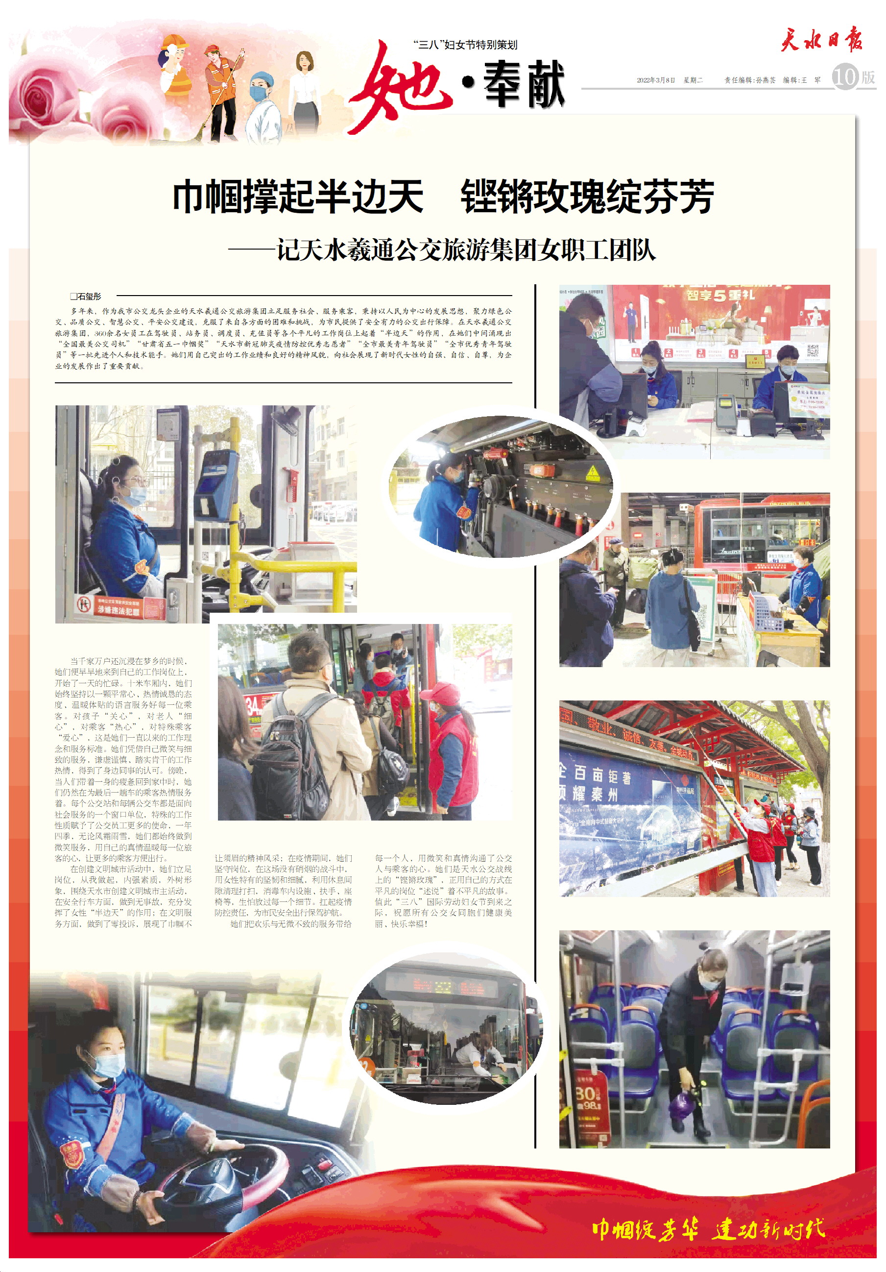 她们把欢乐与无微不致的服务带给每一个人,用微笑和真情沟通了公交人与乘客的心。她们是天水公交战线上的“铿锵玫瑰”,正用自己的方式在平凡的岗位“述说”着不平凡的故事。值此“三八”国际劳动妇女节到来之际,祝愿所有公交女同胞们健康美丽、快乐幸福!