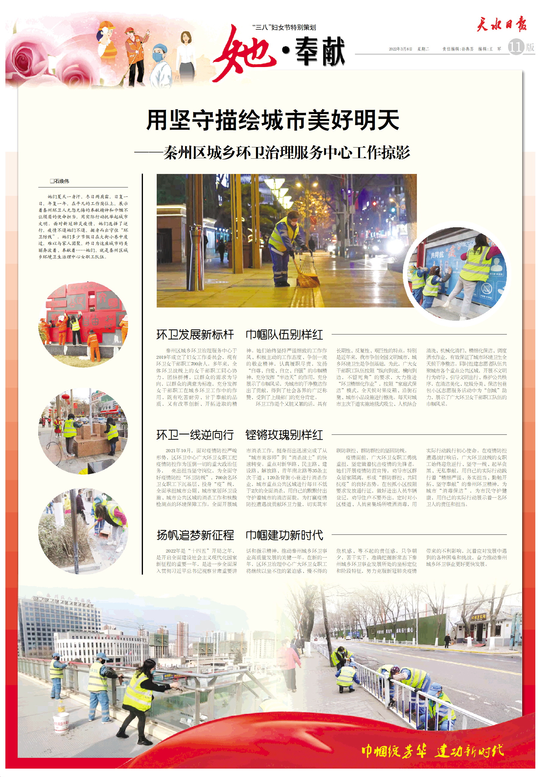 她们夏天一身汗,冬日两肩霜,日复一日,年复一年,在平凡的工作岗位上,展示着秦州环卫人无怨无悔的奉献精神和巾帼不让须眉的使命担当,用实际行动托举起城市文明。面对新冠肺炎疫情,她们选择了逆行,疫情不退她们不退,挺身而出守住“环卫防线”。她们多少节假日在大街小巷中度过,难以与家人团聚,终日为这座城市的美丽奔波着、奉献着……她们,就是秦州区城乡环境卫生治理中心女职工队伍。