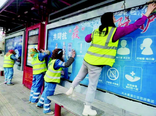 疫情面前,广大环卫女职工勇挑重担,坚定做着抗击疫情的先锋者。她们开展疫情防范宣传,劝导市区群众居家隔离,形成“群防群控、共同抗疫”的良好态势。在包抓小区按照要求发放通行证,做好进出人员车辆登记,劝导住户不要外出,定时对小区楼道、人员密集场所喷洒消毒,用实际行动践行初心使命。在疫情防控遭遇战打响后,广大环卫战线的女职工始终迎危逆行、坚守一线、起早贪黑、无私奉献,用自己的实际行动践行着“精细严谨、务实担当、勤勉开拓、坚守奉献”的秦州环卫精神,为城市“消毒保洁”,为市民守护健康,用自己的实际行动展示着一名环卫人的责任和担当。
