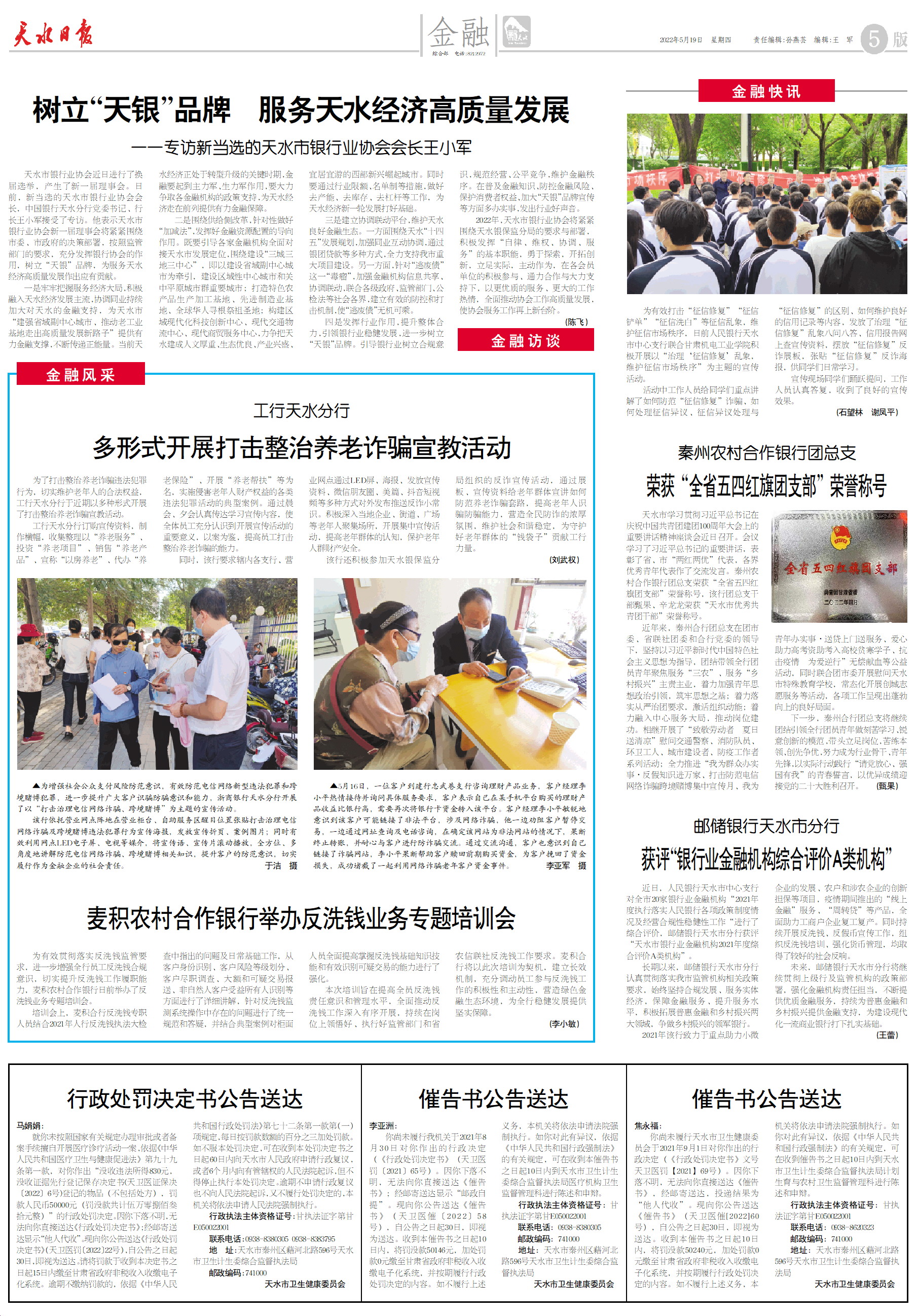 近年来,秦州合行团总支在团市委、省联社团委和合行党委的领导下,坚持以习近平新时代中国特色社会主义思想为指导,团结带领全行团员青年聚焦服务“三农”、服务“乡村振兴”主责主业,着力加强青年思想政治引领,筑牢思想之基;着力落实从严治团要求,激活组织动能;着力融入中心服务大局,推动岗位建功。相继开展了“致敬劳动者 夏日送清凉”慰问交通警察、消防队员、环卫工人、城市建设者、防疫工作者系列活动;全力推进“我为群众办实事·反假知识进万家、打击防范电信网络诈骗跨境赌博集中宣传月、我为青年办实事·送贷上门送服务、爱心助力高考资助考入高校贫寒学子、抗击疫情 为爱逆行”无偿献血等公益活动,同时联合团市委开展慰问天水市特殊教育学校,常态化开展创城志愿服务等活动,各项工作呈现出蓬勃向上的良好局面。