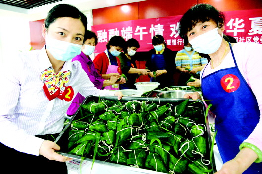 5月25日,江苏省镇江市润州花园社区居民和志愿者在包粽子比赛中展示包好的粽子。端午将至,人们用包粽子的方式迎接传统节日的到来。