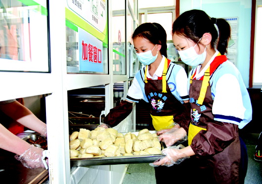 5月24日,青岛海逸学校的“小帮厨”在进行志愿服务。