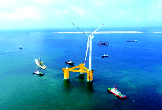 5月29日,国内首台深远海浮式风电装备“扶摇号”从茂名广港码头拖航前往罗斗沙海域进行示范应用(无人机照片)。