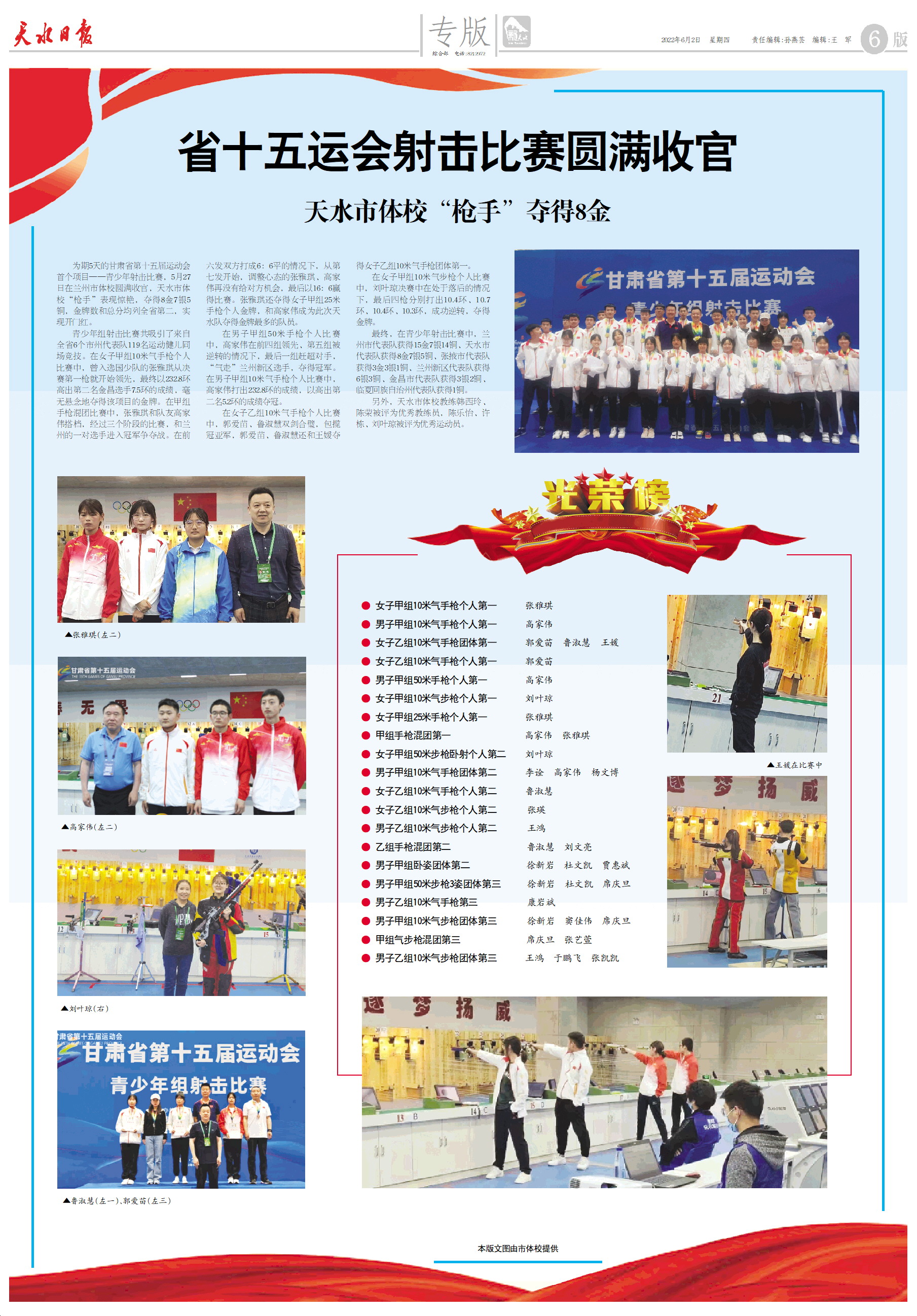 为期5天的甘肃省第十五届运动会首个项目——青少年射击比赛,5月27日在兰州市体校圆满收官,天水市体校“枪手”表现惊艳,夺得8金7银5铜,金牌数和总分均列全省第二,实现开门红。