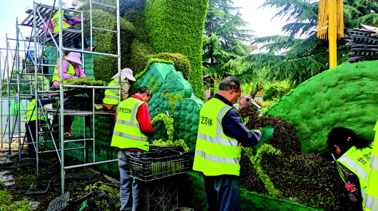 6月10日,工人正在龙城广场搭建生态绿雕。为了喜迎节会,秦州区住建部门连日来在龙城广场、大众路中段等地段,搭建装饰生态绿雕,营造喜庆氛围、美化城市环境。 新天水·天水日报记者 陈少娟 摄