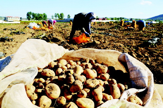 9月28日,村民在甘肃省定西市安定区香泉镇马铃薯种植基地采收马铃薯。