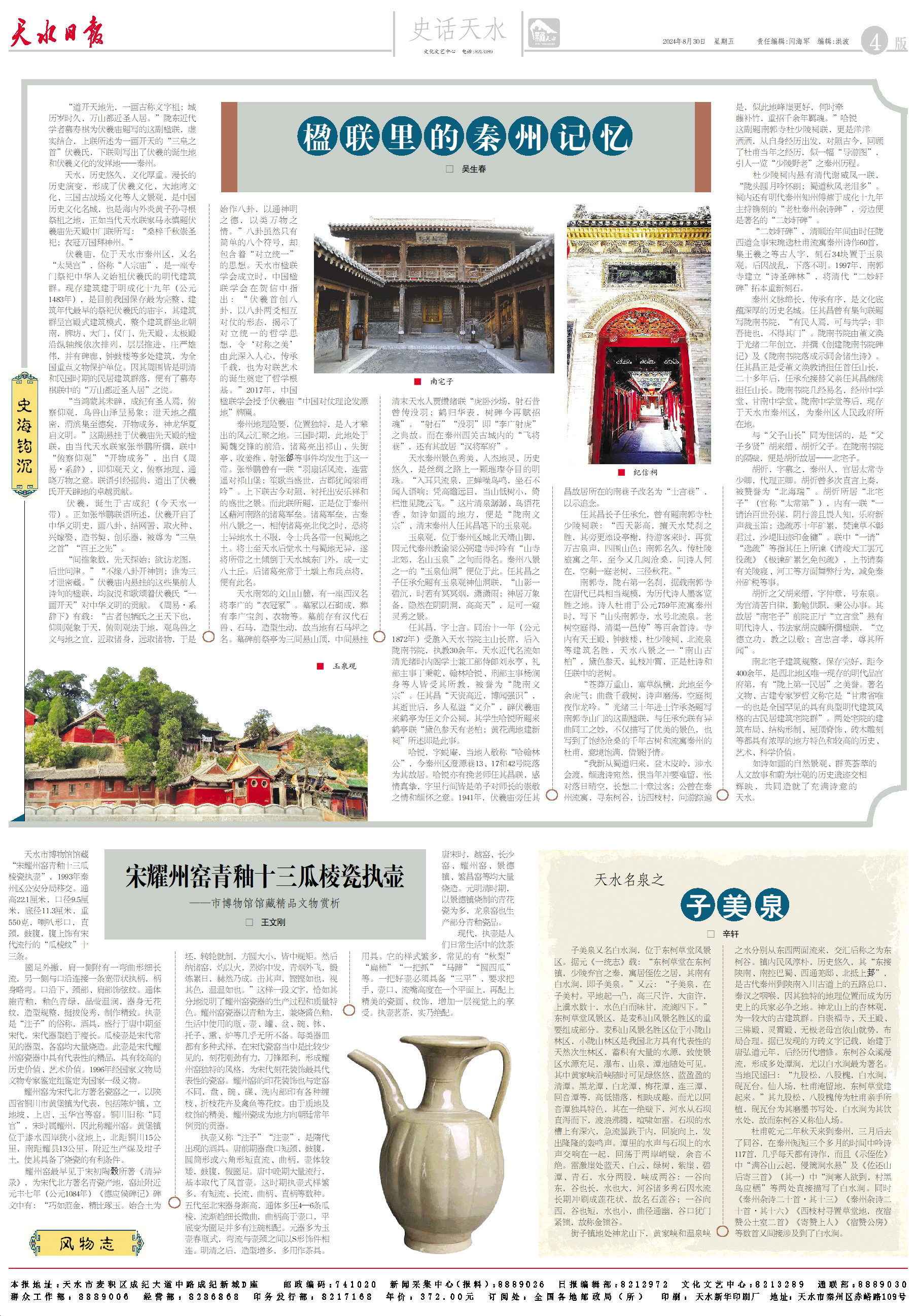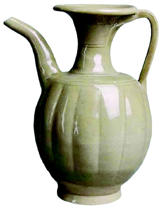 天水市博物馆馆藏“宋耀州窑青釉十三瓜棱瓷执壶”,1993年秦州区公安分局移交。通高22.1厘米,口径9.5厘米,底径11.3厘米,重550克,喇叭形口,直颈,鼓腹,腹上饰有宋代流行的“瓜棱纹”十三条。