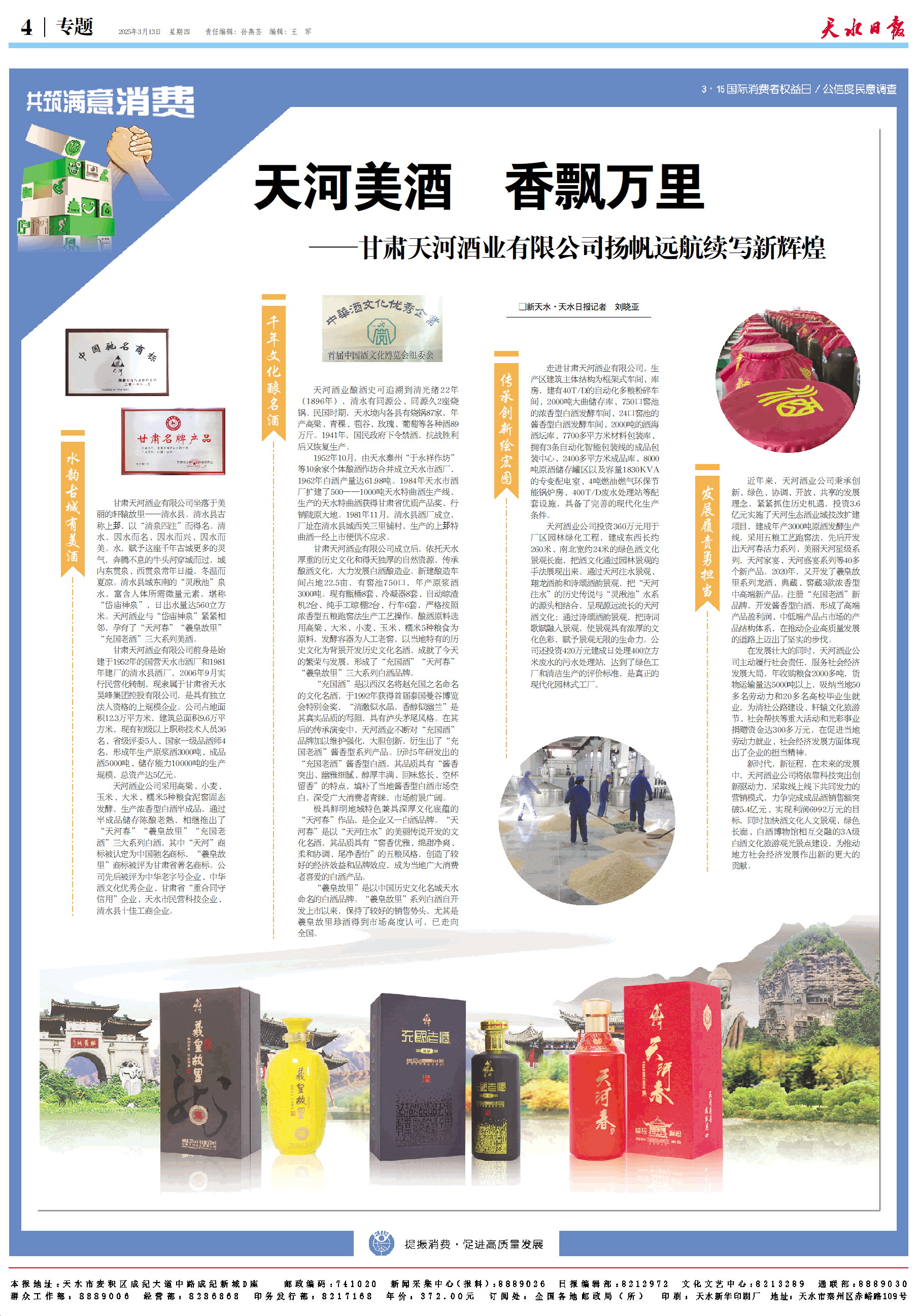 天河酒业公司采用高粱、小麦、玉米、大米、糯米5种粮食泥窖固态发酵,生产浓香型白酒半成品,通过半成品储存陈酿老熟,相继推出了“天河春”“羲皇故里”“充国老酒”三大系列白酒,其中“天河”商标被认定为中国驰名商标,“羲皇故里”商标被评为甘肃省著名商标。公司先后被评为中华老字号企业、中华酒文化优秀企业、甘肃省“重合同守信用”企业、天水市民营科技企业、清水县十佳工商企业。