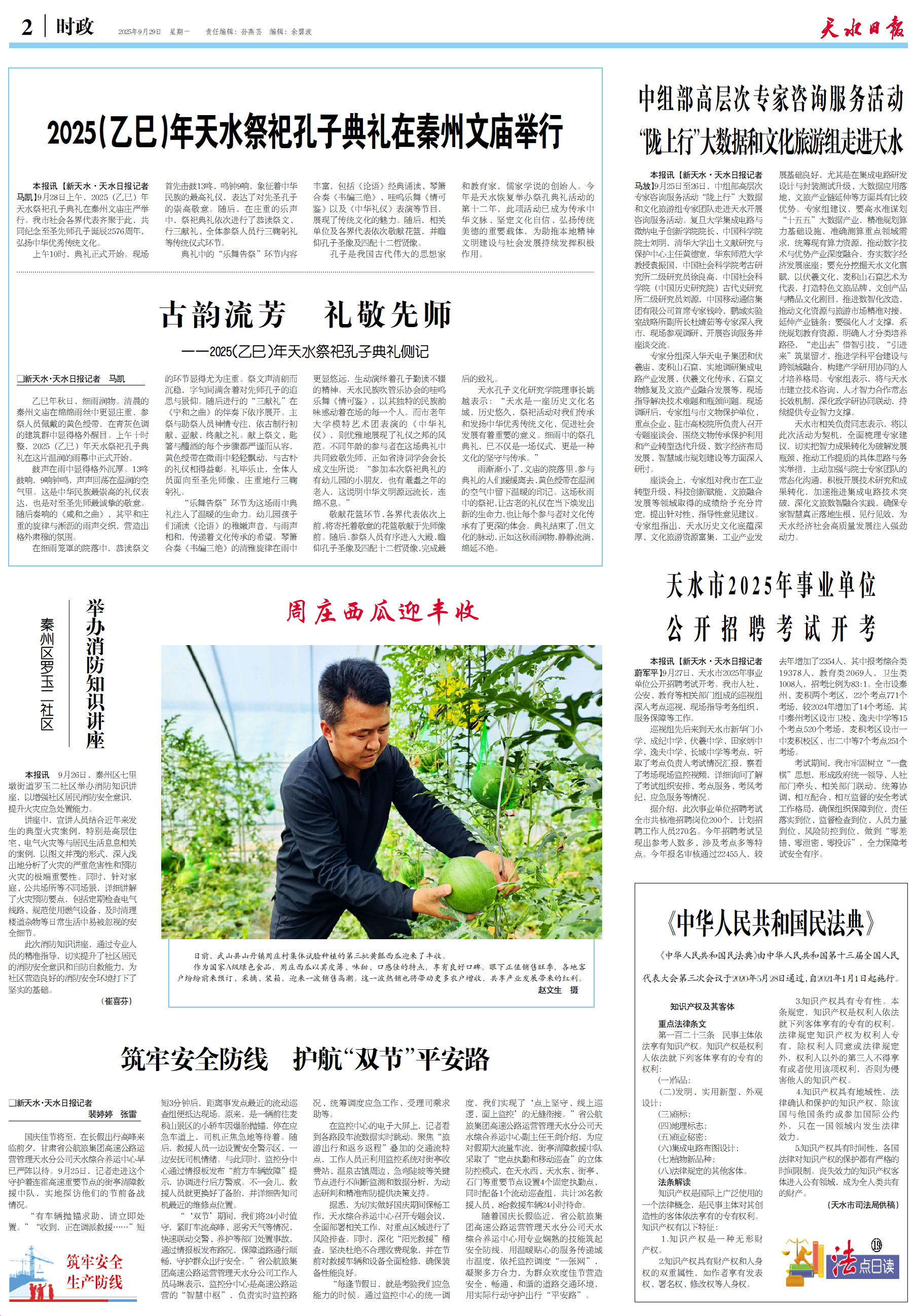 本报讯【新天水·天水日报记者马凯】9月28日上午,2025(乙巳)年天水祭祀孔子典礼在秦州文庙庄严举行。我市社会各界代表齐聚于此,共同纪念至圣先师孔子诞辰2576周年,弘扬中华优秀传统文化。