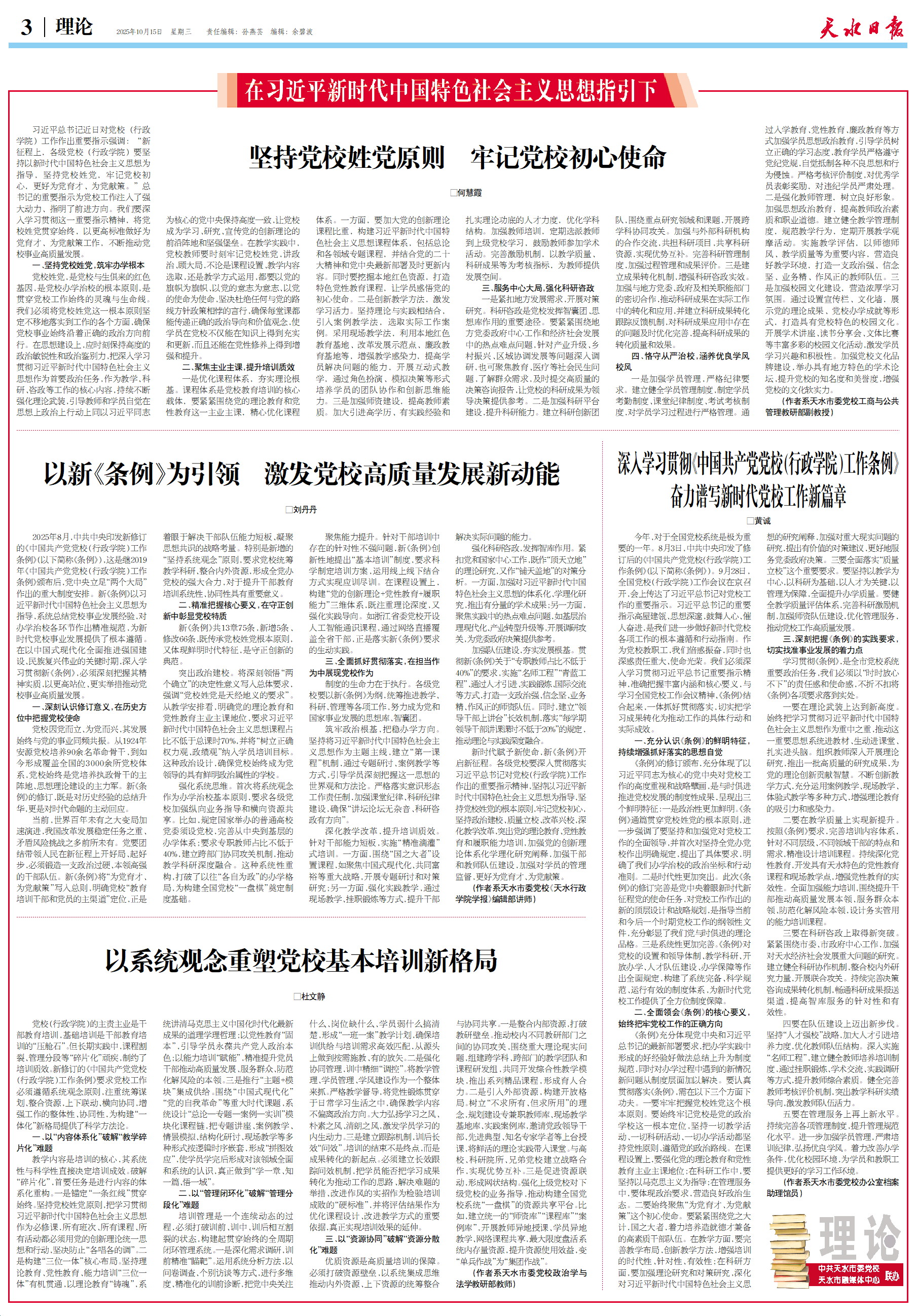 习近平总书记近日对党校(行政学院)工作作出重要指示强调:“新征程上,各级党校(行政学院)要坚持以新时代中国特色社会主义思想为指导,坚持党校姓党,牢记党校初心,更好为党育才、为党献策。”总书记的重要指示为党校工作注入了强大动力、指明了前进方向。我们要深入学习贯彻这一重要指示精神,将党校姓党贯穿始终,以更高标准做好为党育才、为党献策工作,不断推动党校事业高质量发展。 一、坚持党校姓党,筑牢办学根本 党校姓党,是党校与生俱来的红色基因,是党校办学治校的根本原则,是贯穿党校工作始终的灵魂与生命线。我们必须将党校姓党这一根本原则坚定不移地落实到工作的各个方面,确保党校事业始终沿着正确的政治方向前行。在思想建设上,应时刻保持高度的政治敏锐性和政治鉴别力,把深入学习贯彻习近平新时代中国特色社会主义思想作为首要政治任务,作为教学、科研、咨政等工作的核心内容,持续不断强化理论武装,引导教师和学员自觉在思想上政治上行动上同以习近平同志为核心的党中央保持高度一致,让党校成为学习、研究、宣传党的创新理论的前沿阵地和坚强堡垒。在教学实践中,党校教师要时刻牢记党校姓党,讲政治、顾大局,不论是课程设置、教学内容选取,还是教学方式运用,都要以党的旗帜为旗帜、以党的意志为意志、以党的使命为使命,坚决杜绝任何与党的路线方针政策相悖的言行,确保每堂课都能传递正确的政治导向和价值观念,使学员在党校不仅能在知识上得到充实和更新,而且还能在党性修养上得到增强和提升。 二、聚焦主业主课,提升培训质效 一是优化课程体系,夯实理论根基。课程体系是党校教育培训的核心载体,要紧紧围绕党的理论教育和党性教育这一主业主课,精心优化课程体系。一方面,要加大党的创新理论课程比重,构建习近平新时代中国特色社会主义思想课程体系,包括总论和各领域专题课程,并结合党的二十大精神和党中央最新部署及时更新内容。同时要挖掘本地红色资源,打造特色党性教育课程,让学员感悟党的初心使命。二是创新教学方法,激发学习活力。坚持理论与实践相结合,引入案例教学法,选取实际工作案例。采用现场教学法,利用本地红色教育基地、改革发展示范点、廉政教育基地等,增强教学感染力,提高学员解决问题的能力,开展互动式教学,通过角色扮演、模拟决策等形式培养学员的团队协作和创新思维能力。三是加强师资建设,提高教师素质。加大引进高学历、有实践经验和扎实理论功底的人才力度,优化学科结构。加强教师培训,定期选派教师到上级党校学习,鼓励教师参加学术活动。完善激励机制,以教学质量、科研成果等为考核指标,为教师提供发展空间。 三、服务中心大局,强化科研咨政 一是紧扣地方发展需求,开展对策研究。科研咨政是党校发挥智囊团、思想库作用的重要途径。要紧紧围绕地方党委政府中心工作和经济社会发展中的热点难点问题,针对产业升级、乡村振兴、区域协调发展等问题深入调研,也可聚焦教育、医疗等社会民生问题,了解群众需求,及时提交高质量的决策咨询报告,让党校的科研成果为领导决策提供参考。二是加强科研平台建设,提升科研能力。建立科研创新团队,围绕重点研究领域和课题,开展跨学科协同攻关。加强与外部科研机构的合作交流,共担科研项目,共享科研资源,实现优势互补。完善科研管理制度,加强过程管理和成果评价。三是建立成果转化机制,增强科研咨政实效。加强与地方党委、政府及相关职能部门的密切合作,推动科研成果在实际工作中的转化和应用,并建立科研成果转化跟踪反馈机制,对科研成果应用中存在的问题及时优化完善,提高科研成果的转化质量和效果。 四、恪守从严治校,涵养优良学风校风 一是加强学员管理,严格纪律要求。建立健全学员管理制度,制定学员考勤制度、课堂纪律制度、考试考核制度,对学员学习过程进行严格管理。通过入学教育、党性教育、廉政教育等方式加强学员思想政治教育,引导学员树立正确的学习态度,教育学员严格遵守党纪党规,自觉抵制各种不良思想和行为侵蚀。严格考核评价制度,对优秀学员表彰奖励,对违纪学员严肃处理。二是强化教师管理,树立良好形象。加强思想政治教育,提高教师政治素质和职业道德。建立健全教学管理制度,规范教学行为,定期开展教学观摩活动。实施教学评估,以师德师风、教学质量等为重要内容,营造良好教学环境,打造一支政治强、信念坚、业务精、作风正的教师队伍。三是加强校园文化建设,营造浓厚学习氛围。通过设置宣传栏、文化墙,展示党的理论成果、党校办学成就等形式,打造具有党校特色的校园文化。开展学术讲座、读书分享会、文体比赛等丰富多彩的校园文化活动,激发学员学习兴趣和积极性。加强党校文化品牌建设,举办具有地方特色的学术论坛,提升党校的知名度和美誉度,增强党校的文化软实力。 (作者系天水市委党校工商与公共管理教研部副教授)