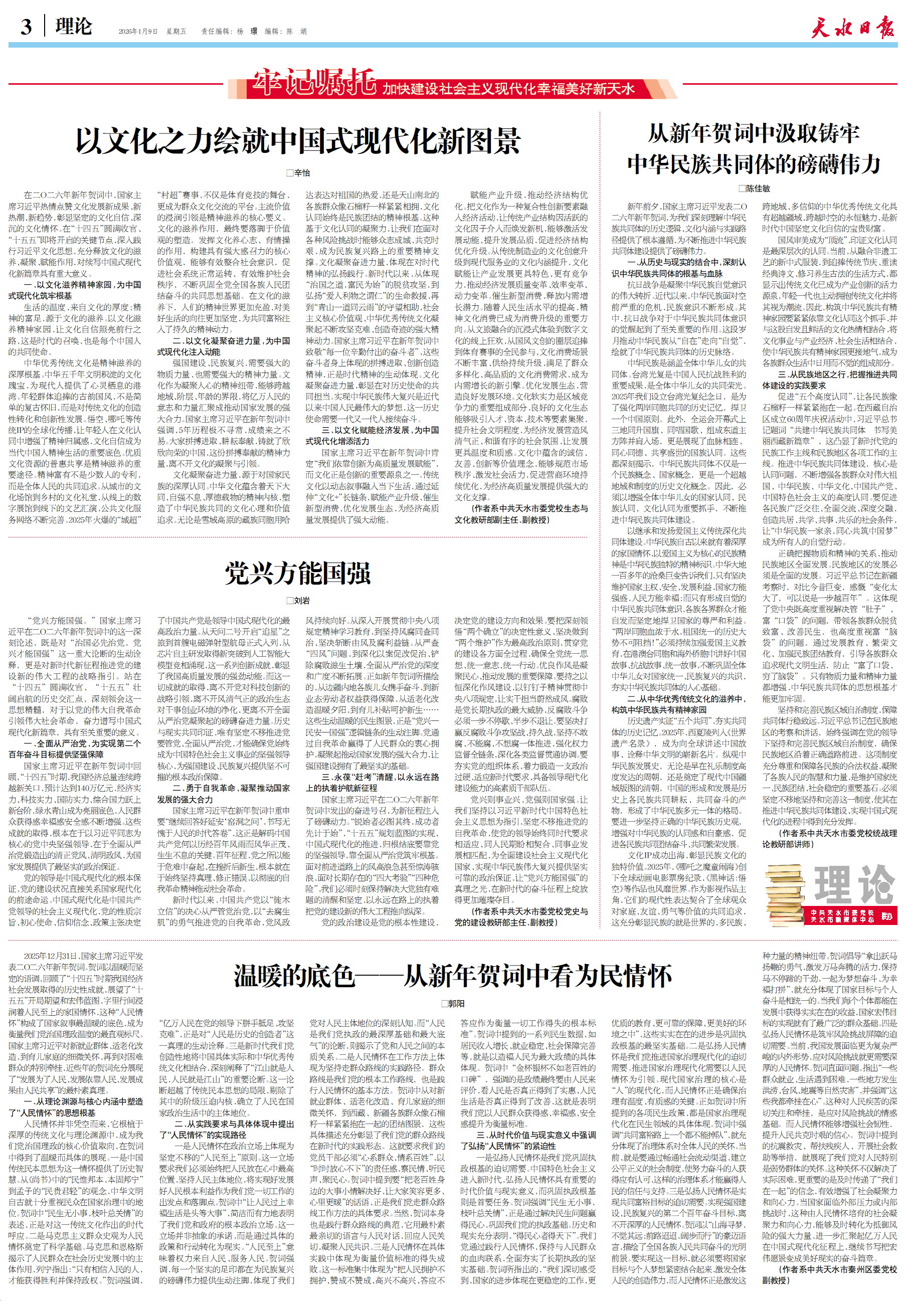 在二O二六年新年贺词中,国家主席习近平热情点赞文化发展新成果、新热潮、新趋势,彰显坚定的文化自信、深沉的文化情怀。在“十四五”圆满收官、“十五五”即将开启的关键节点,深入践行习近平文化思想,充分释放文化的滋养、凝聚、赋能作用,对续写中国式现代化新篇章具有重大意义。