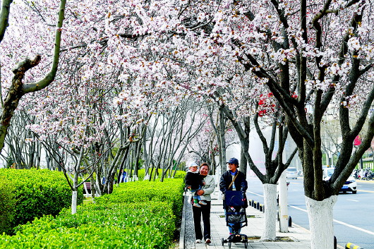 仲春时节,秦州区春意盎然,行道树繁花盛放,草木返青吐绿,城市街巷生机勃勃。市民在繁花掩映的人行道上出行、休闲,尽享春日暖意。近年来,我市持续推进城市绿化美化,生态环境持续改善,群众获得感不断提升。 天水融媒记者 周文涛 摄