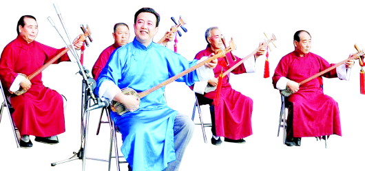 手里没家伙的,就一边唱,一边照看火炉、点烟倒茶。杨家二爸戴了茶色石头镜,看不出眼睛是睁是闭,有节奏地敲着摔子,美滋滋地摇头晃脑,俨然是个指挥家。李家三爸拉板胡,眼睛瞅定了墙上的一幅画,半天不回头,似乎那上面风景无限,嘴角的烟卷灰老长了,欲坠不坠。他三太爷手执“嘎拉机”——两片挂满铜钱的小木板,一分一合,用一支小木锯拉出有节奏的声响。杨老二横了长笛,笑意太多,有点拢不住气,不时用舌头舔舔嘴皮子。父亲的绝活是捏“四片瓦”,坐着不过瘾,就站起来,两臂左右开弓、上下挥动,两手一开一合,或磕或摇,好像掌着两只振翅翻飞的小鸟,发出串串欢快悦耳的啭鸣,在悠扬的旋律中自由穿插。李老大眉飞色舞,怀抱那把蒙着蟒皮的三弦子,眼神在每个人脸上扫描,看见大伙都如此投入,自己也不禁陶醉起来,嘣嘣梆梆,弹唱得更加起劲:“我来拜节贺新春,上写春联好精通:天增岁月人增寿,春满乾坤福满门。吉祥如意紧随跟,贺新春。这才是——万象更新,喜过新年!”