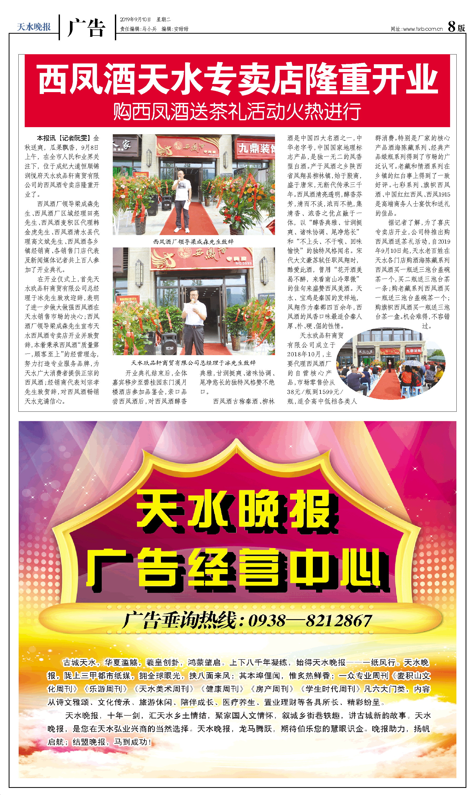 本报讯【记者阮雯】金秋送爽,瓜果飘香,9月8日上午,在全市人民和业界关注下,位于成纪大道恒顺锦润悦府天水玖品轩商贸有限公司的西凤酒专卖店隆重开业了。 西凤酒厂领导梁成森先生、西凤酒厂区域经理田亮先生、西凤酒麦积区代理韩金虎先生、西凤酒清水县代理高文斌先生、西凤酒各乡镇经销商、各销售门店代表及新闻媒体记者共上百人参加了开业典礼。 在开业仪式上,首先天水玖品轩商贸有限公司总经理于冰先生致欢迎辞,表明了进一步做大做强西凤酒在天水销售市场的决心;西凤酒厂领导梁成森先生宣布天水西凤酒专卖店开业并致贺辞,本着秉承西凤酒“质量第一,顾客至上”的经营理念,努力打造专业服务品牌,为天水广大消费者提供正宗的西凤酒;经销商代表刘宗孝先生致贺辞,对西凤酒畅销天水充满信心。 开业典礼结束后,全体嘉宾移步至碧桂园东门溪月楼酒店参加品鉴会,亲口品尝西凤酒后,对西凤酒醇香典雅,甘润挺爽、诸味协调、尾净悠长的独特风格赞不绝口。 西凤酒古称秦酒、柳林酒是中国四大名酒之一,中华老字号,中国国家地理标志产品,是独一无二的凤香型白酒。产于凤酒之乡陕西省凤翔县柳林镇,始于殷商,盛于唐宋,无断代传承三千年。西凤酒清亮透明,醇香芬芳,清而不淡,浓而不艳,集清香、浓香之优点融于一体,以“醇香典雅、甘润挺爽、诸味协调、尾净悠长”和“不上头、不干喉、回味愉快”的独特风格闻名。宋代大文豪苏轼任职凤翔时,酷爱此酒,曾用“花开酒美曷不醉,来看南山冷翠微”的佳句来盛赞西凤美酒。天水、宝鸡是秦国的发祥地,凤翔作为秦都四百余年,西凤酒的凤香口味最适合秦人厚、朴、硬、倔的性情。 天水玖品轩商贸有限公司成立于2018年10月,主要代理西凤酒厂的自营核心产品,市场零售价从38元/瓶到1599元/瓶,适合高中低档各类人群消费。特别是厂家的核心产品酒海陈藏系列、经典产品绿瓶系列得到了市场的广泛认可。老藏和情酒系列在乡镇的红白事上得到了一致好评。七彩系列、旗帜西凤酒、中国红红西凤、西凤1915是高端商务人士宴饮和送礼的佳品。 据记者了解,为了喜庆专卖店开业,公司特推出购西凤酒送茶礼活动,自2019年9月10日起,天水老百姓在天水各门店购酒海陈藏系列西凤酒买一瓶送三泡台盖碗茶一个,买二瓶送三泡台茶一条;购老藏系列西凤酒买一瓶送三泡台盖碗茶一个;购旗帜西凤酒买一瓶送三泡台茶一盒。机会难得,不容错过。