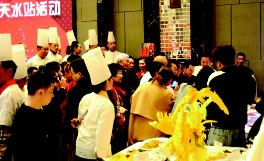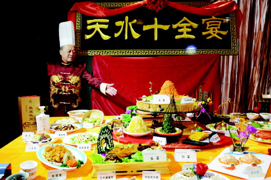 漫长的岁月中,天水形成了菜式繁多、烹调考究、质优味美的特色,酸辣里脊、天水杂烩、八大碗、十三花……展台上摆放着每一道让人垂涎的美食,每一位个性鲜明的师傅烹饪技艺的菜色,让参观者难以抗拒美食的诱惑。