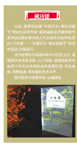 日前,荟萃前四届“中国天水·李杜诗歌节”80余位获奖作者、颁奖嘉宾及历届诗歌节系列活动国内著名诗人天水采风作品200余首的《天水课——“中国天水·李杜诗歌节”采风作品选》出版发行。