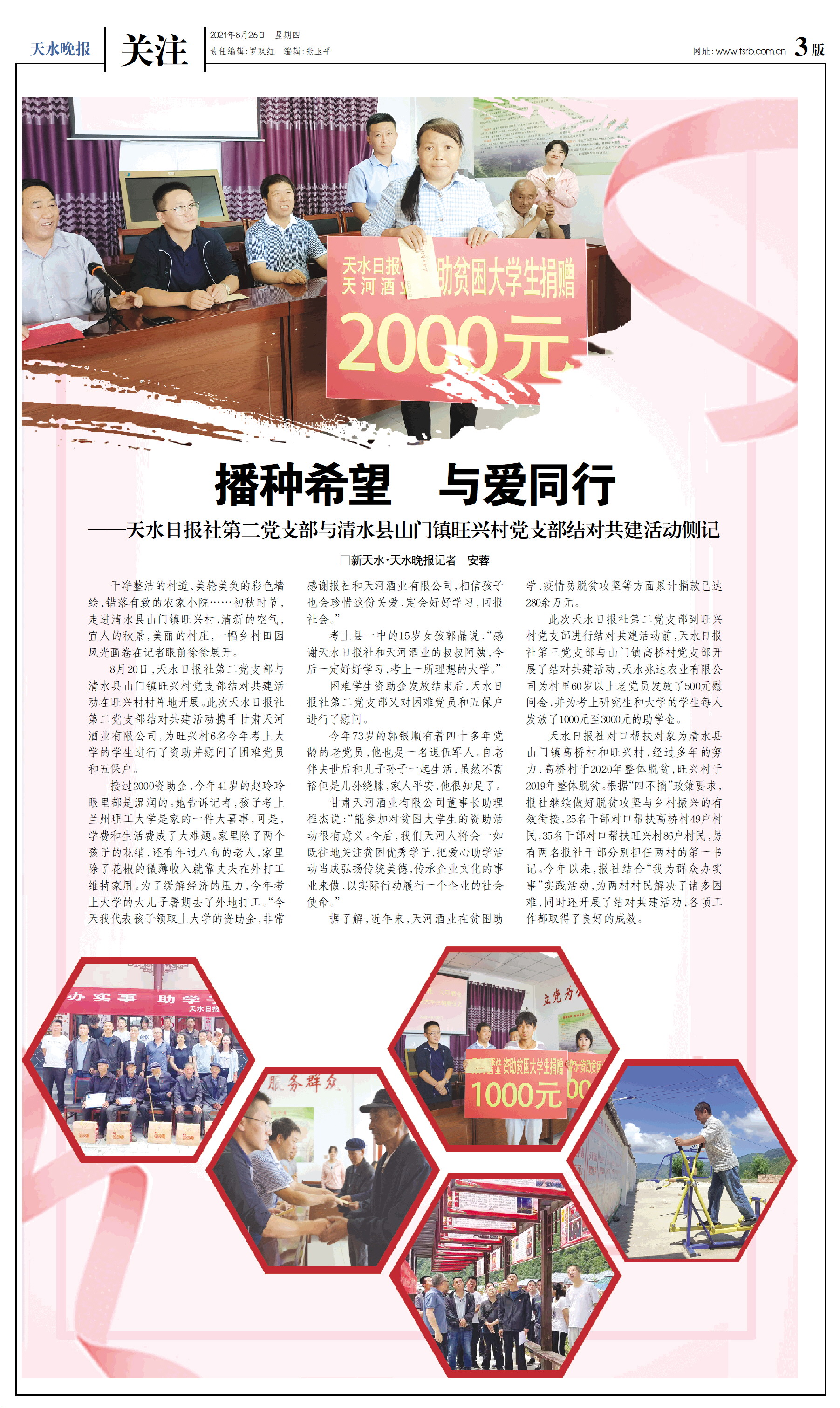 此次天水日报社第二党支部到旺兴村党支部进行结对共建活动前,天水日报社第三党支部与山门镇高桥村党支部开展了结对共建活动,天水兆达农业有限公司为村里60岁以上老党员发放了500元慰问金,并为考上研究生和大学的学生每人发放了1000元至3000元的助学金。