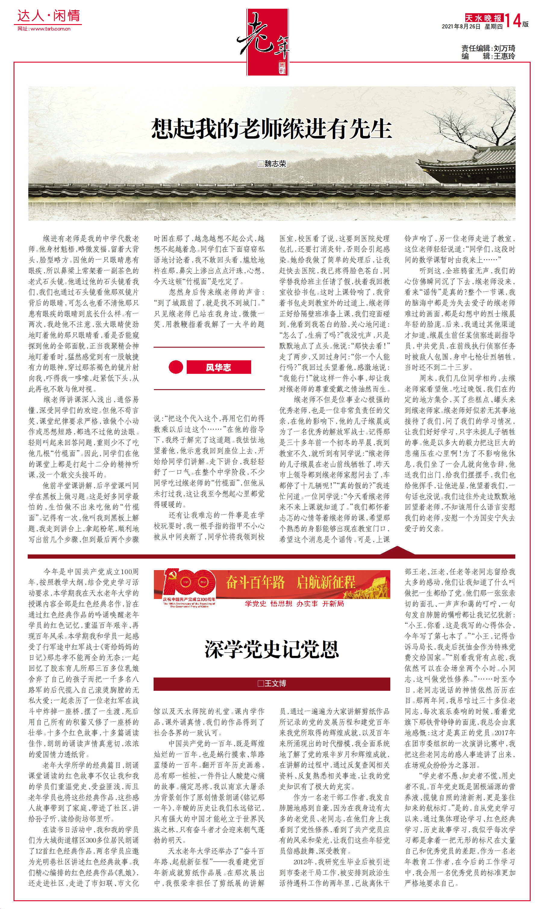 今年是中国共产党成立100周年,按照教学大纲,结合党史学习活动要求,本学期我在天水老年大学的授课内容全部是红色经典名作,旨在通过红色经典作品的吟诵唤醒老年学员的红色记忆,重温百年艰辛、再现百年风采。本学期我和学员一起感受了行军途中红军战士《寄给妈妈的日记》那忠孝不能两全的无奈;一起回忆了胶东育儿所那三百多位乳娘舍弃了自己的孩子而把一千多名八路军的后代揽入自己滚烫胸膛的无私大爱;一起亲历了一位老红军在战斗中炸掉一座桥,摆了一生渡,死后用自己所有的积蓄又修了一座桥的壮举。十多个红色故事,十多篇诵读佳作,朗朗的诵读声情真意切,浓浓的爱国情力透纸背。