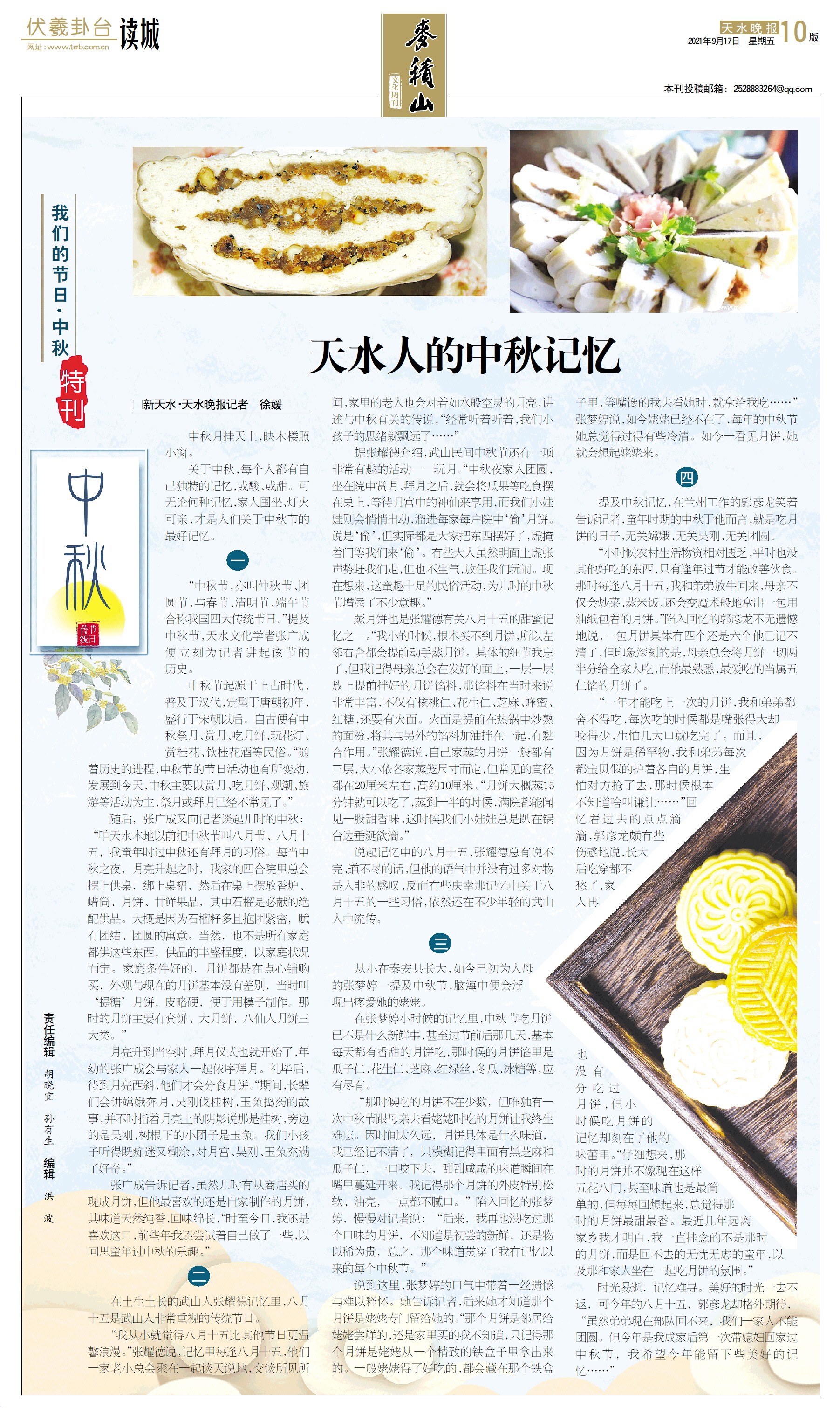 “中秋节,亦叫仲秋节、团圆节,与春节、清明节、端午节合称我国四大传统节日。”提及中秋节,天水文化学者张广成便立刻为记者讲起该节的历史。