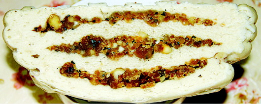 蒸月饼也是张耀德有关八月十五的甜蜜记忆之一。“我小的时候,根本买不到月饼,所以左邻右舍都会提前动手蒸月饼。具体的细节我忘了,但我记得母亲总会在发好的面上,一层一层放上提前拌好的月饼馅料,那馅料在当时来说非常丰富,不仅有核桃仁、花生仁、芝麻、蜂蜜、红糖,还要有火面。火面是提前在热锅中炒熟的面粉,将其与另外的馅料加油拌在一起,有黏合作用。”张耀德说,自己家蒸的月饼一般都有三层,大小依各家蒸笼尺寸而定,但常见的直径都在20厘米左右,高约10厘米。“月饼大概蒸15分钟就可以吃了,蒸到一半的时候,满院都能闻见一股甜香味,这时候我们小娃娃总是趴在锅台边垂涎欲滴。”