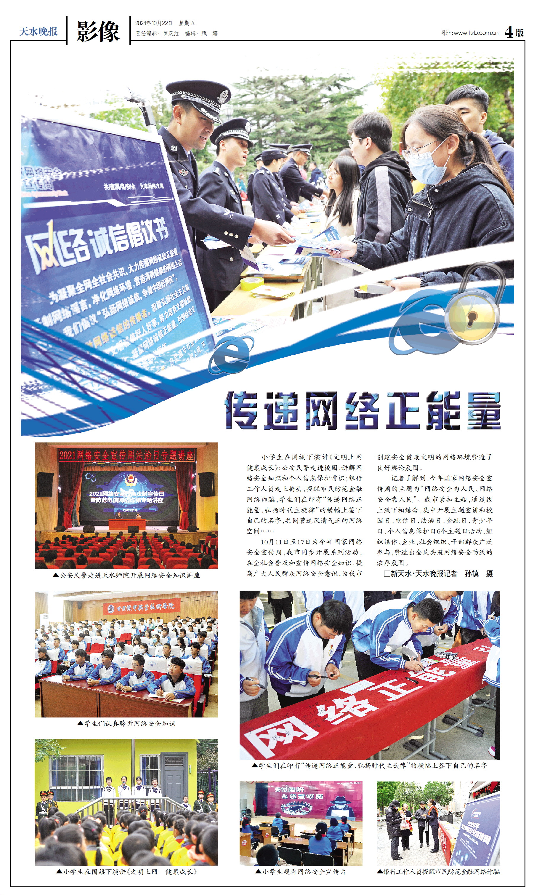 小学生在国旗下演讲《文明上网 健康成长》;公安民警走进校园,讲解网络安全知识和个人信息保护常识;银行工作人员走上街头,提醒市民防范金融网络诈骗;学生们在印有“传递网络正能量、弘扬时代主旋律”的横幅上签下自己的名字,共同营造风清气正的网络空间……