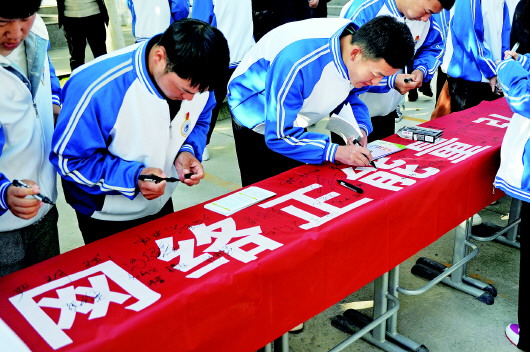 ▲学生们在印有“传递网络正能量、弘扬时代主旋律”的横幅上签下自己的名字