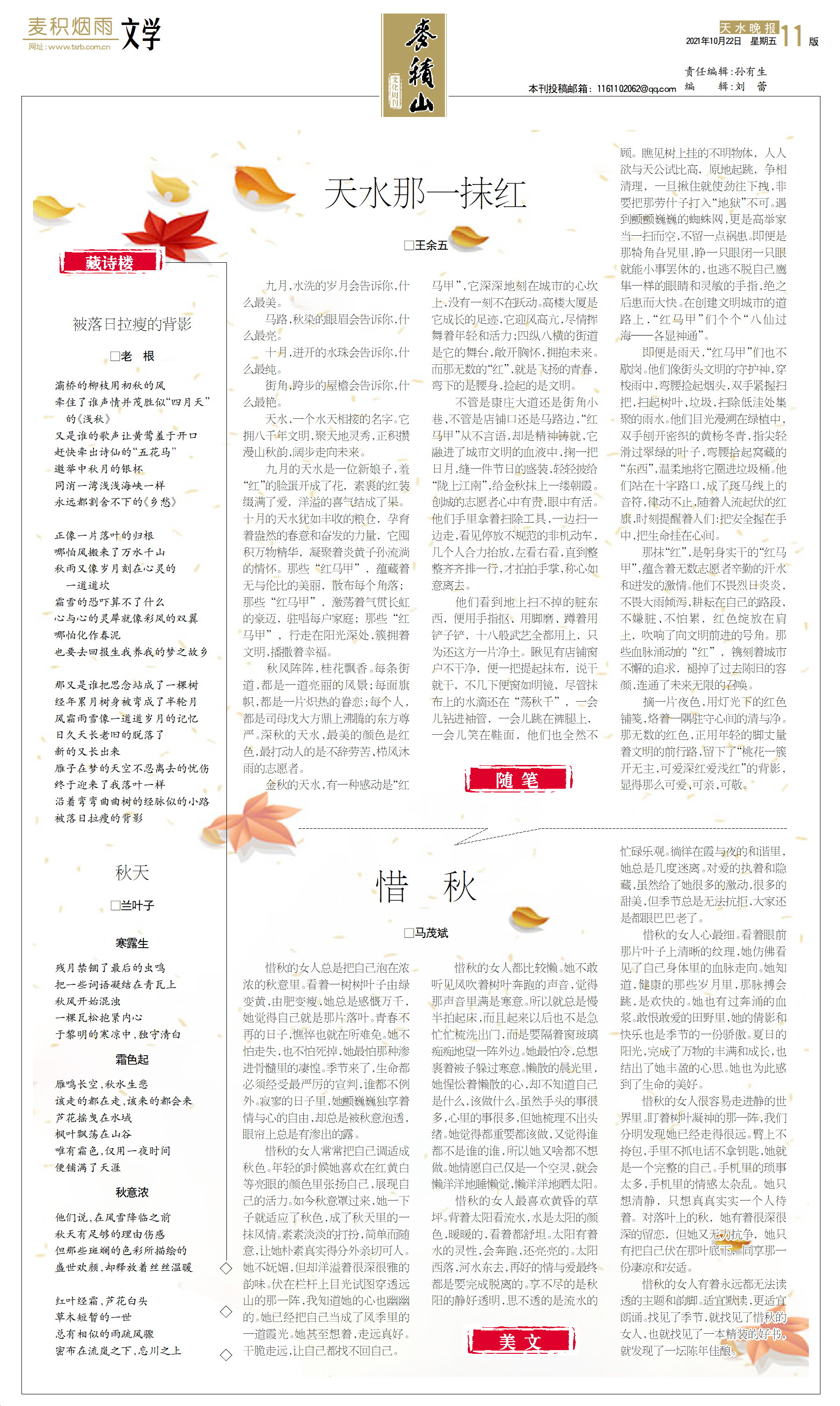 惜秋的女人常常把自己调适成秋色。年轻的时候她喜欢在红黄白等亮眼的颜色里张扬自己,展现自己的活力。如今秋意罩过来,她一下子就适应了秋色,成了秋天里的一抹风情。素素淡淡的打扮,简单而随意,让她朴素真实得分外亲切可人。她不妩媚,但却洋溢着很深很雅的韵味。伏在栏杆上目光试图穿透远山的那一阵,我知道她的心也幽幽的。她已经把自己当成了风季里的一道霞光。她甚至想着,走远真好。干脆走远,让自己都找不回自己。