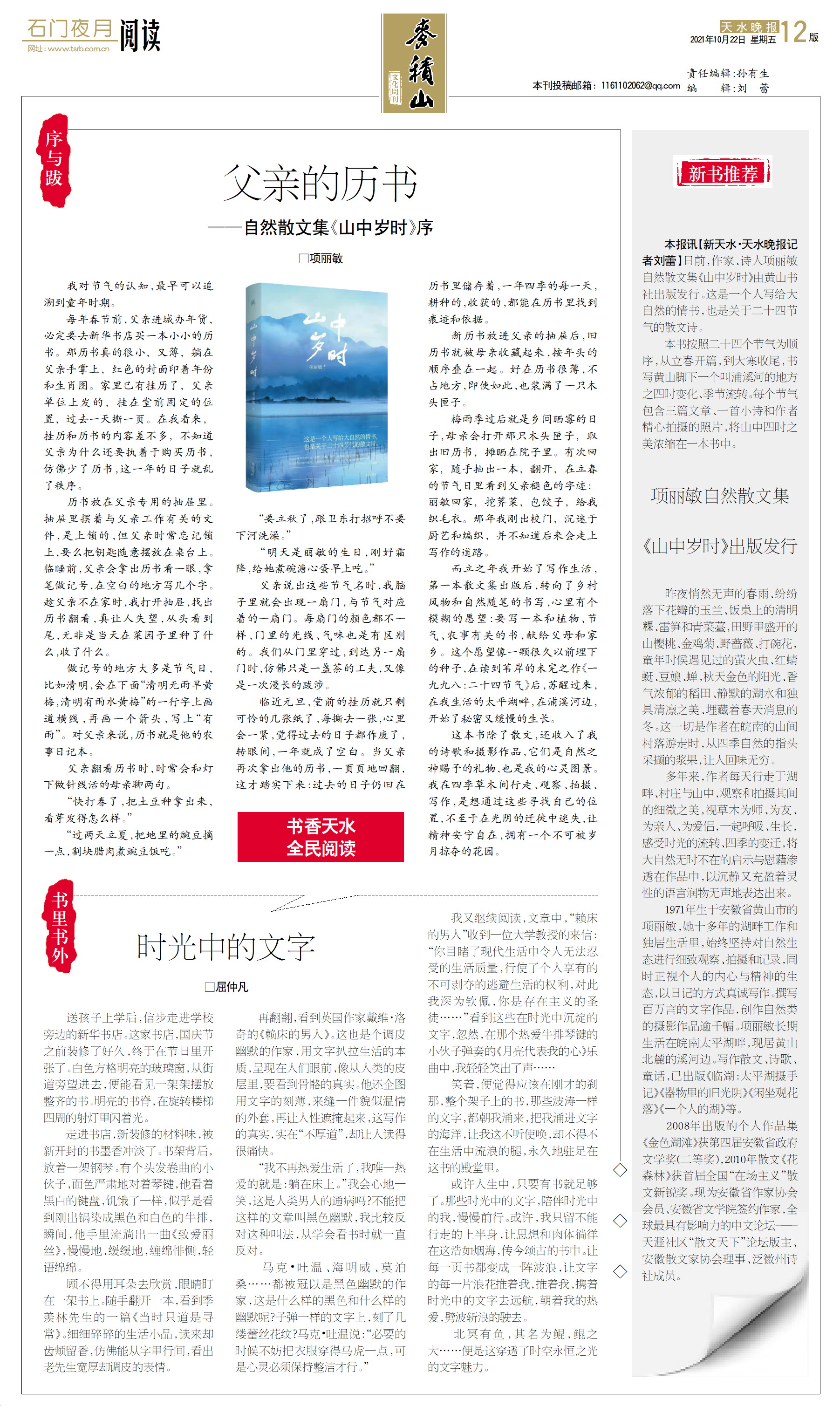 梅雨季过后就是乡间晒霉的日子,母亲会打开那只木头匣子,取出旧历书,摊晒在院子里。有次回家,随手抽出一本,翻开,在立春的节气日里看到父亲褪色的字迹:丽敏回家,挖荠菜,包饺子,给我织毛衣。那年我刚出校门,沉迷于厨艺和编织,并不知道后来会走上写作的道路。