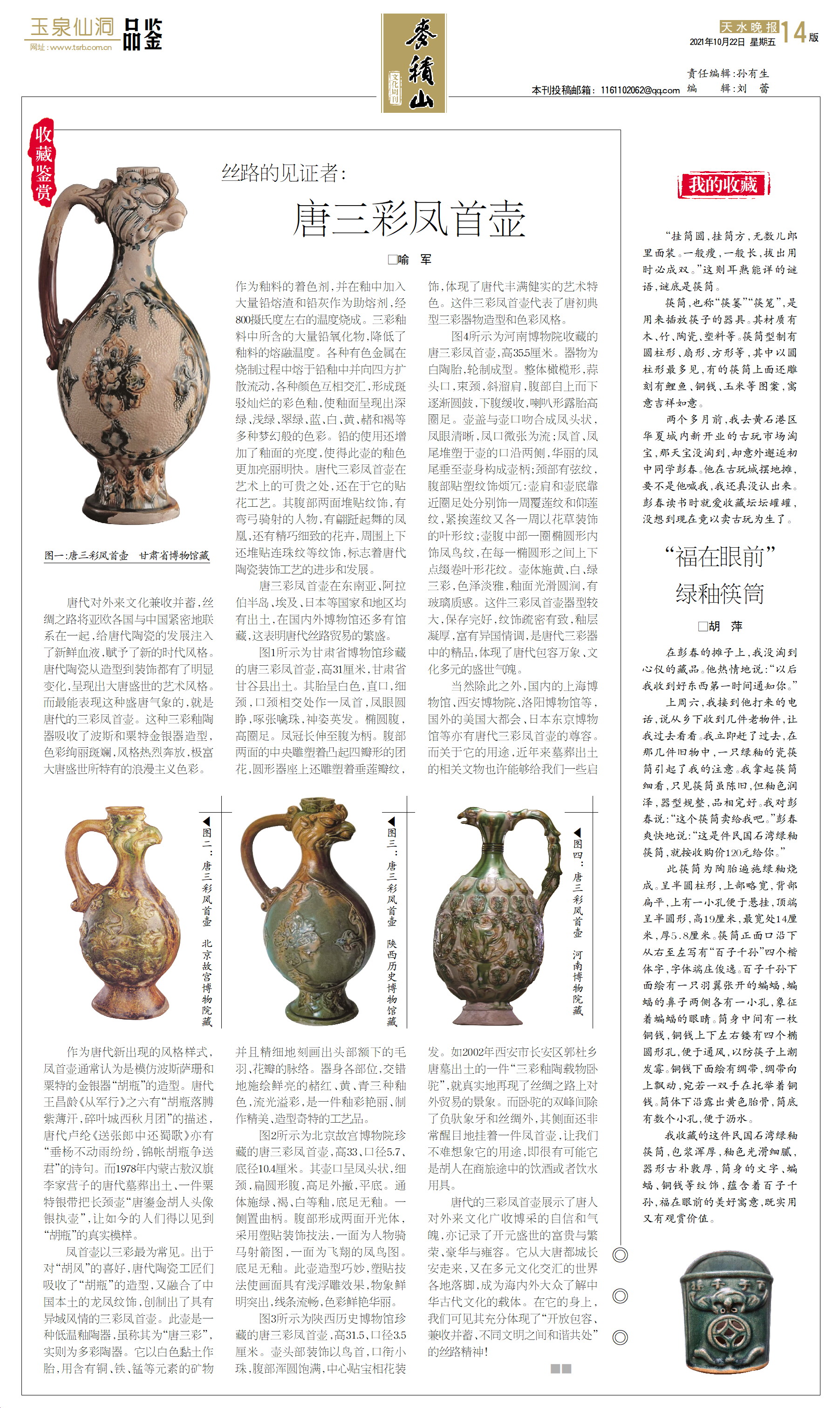 唐代的三彩凤首壶展示了唐人对外来文化广收博采的自信和气魄,亦记录了开元盛世的富贵与繁荣、豪华与雍容。它从大唐都城长安走来,又在多元文化交汇的世界各地落脚,成为海内外大众了解中华古代文化的载体。在它的身上,我们可见其充分体现了“开放包容、兼收并蓄、不同文明之间和谐共处”的丝路精神!