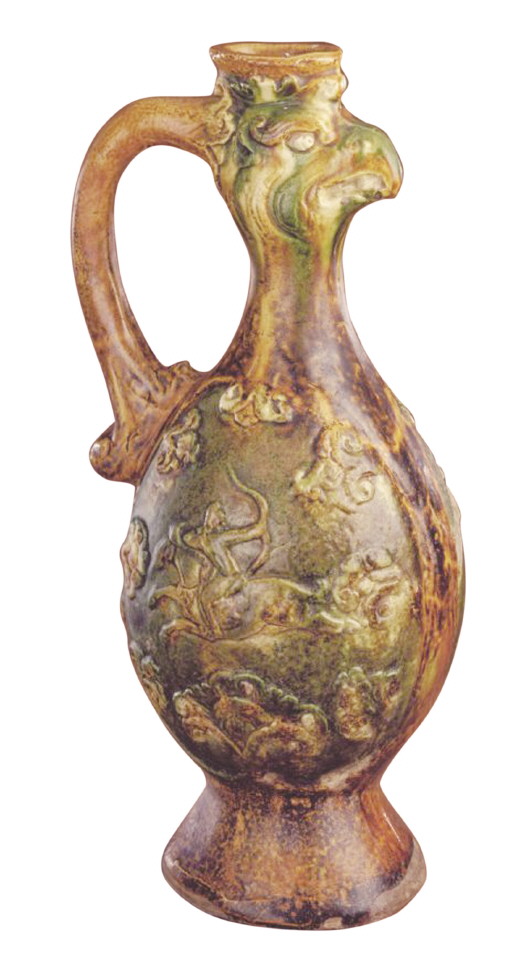 图2所示为北京故宫博物院珍藏的唐三彩凤首壶,高33、口径5.7、底径10.4厘米。其壶口呈凤头状,细颈,扁圆形腹,高足外撇,平底。通体施绿、褐、白等釉,底足无釉。一侧置曲柄。腹部形成两面开光体,采用塑贴装饰技法,一面为人物骑马射箭图,一面为飞翔的凤鸟图。底足无釉。此壶造型巧妙,塑贴技法使画面具有浅浮雕效果,物象鲜明突出,线条流畅,色彩鲜艳华丽。