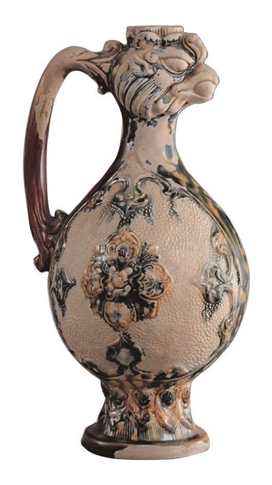 图3所示为陕西历史博物馆珍藏的唐三彩凤首壶,高31.5、口径3.5厘米。壶头部装饰以鸟首,口衔小珠,腹部浑圆饱满,中心贴宝相花装饰,体现了唐代丰满健实的艺术特色。这件三彩凤首壶代表了唐初典型三彩器物造型和色彩风格。