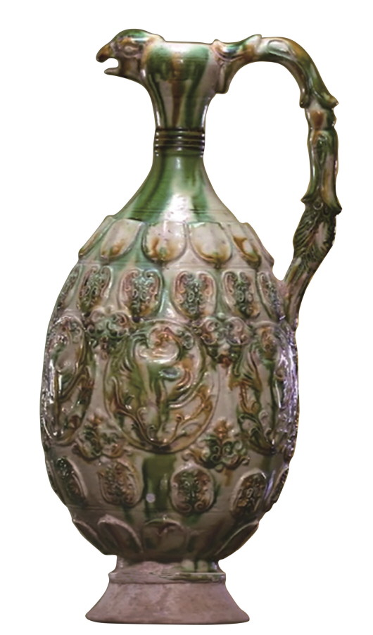 图4所示为河南博物院收藏的唐三彩凤首壶,高35.5厘米。器物为白陶胎,轮制成型。整体橄榄形,蒜头口,束颈,斜溜肩,腹部自上而下逐渐圆鼓,下腹缓收,喇叭形露胎高圈足。壶盖与壶口吻合成凤头状,凤眼清晰,凤口微张为流;凤首、凤尾堆塑于壶的口沿两侧,华丽的凤尾垂至壶身构成壶柄;颈部有弦纹,腹部贴塑纹饰烦冗:壶肩和壶底靠近圈足处分别饰一周覆莲纹和仰莲纹,紧挨莲纹又各一周以花草装饰的叶形纹;壶腹中部一圈椭圆形内饰凤鸟纹,在每一椭圆形之间上下点缀卷叶形花纹。壶体施黄、白、绿三彩,色泽淡雅,釉面光滑圆润,有玻璃质感。这件三彩凤首壶器型较大,保存完好,纹饰疏密有致,釉层凝厚,富有异国情调,是唐代三彩器中的精品,体现了唐代包容万象、文化多元的盛世气魄。