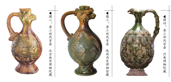 图1所示为甘肃省博物馆珍藏的唐三彩凤首壶,高31厘米,甘肃省甘谷县出土。其胎呈白色,直口,细颈,口颈相交处作一凤首,凤眼圆睁,啄张噙珠,神姿英发。椭圆腹,高圈足。凤冠长伸至腹为柄。腹部两面的中央雕塑着凸起四瓣形的团花,圆形器座上还雕塑着垂莲瓣纹,并且精细地刻画出头部额下的毛羽、花瓣的脉络。器身各部位,交错地施绘鲜亮的赭红、黄、青三种釉色,流光溢彩,是一件釉彩艳丽、制作精美、造型奇特的工艺品。