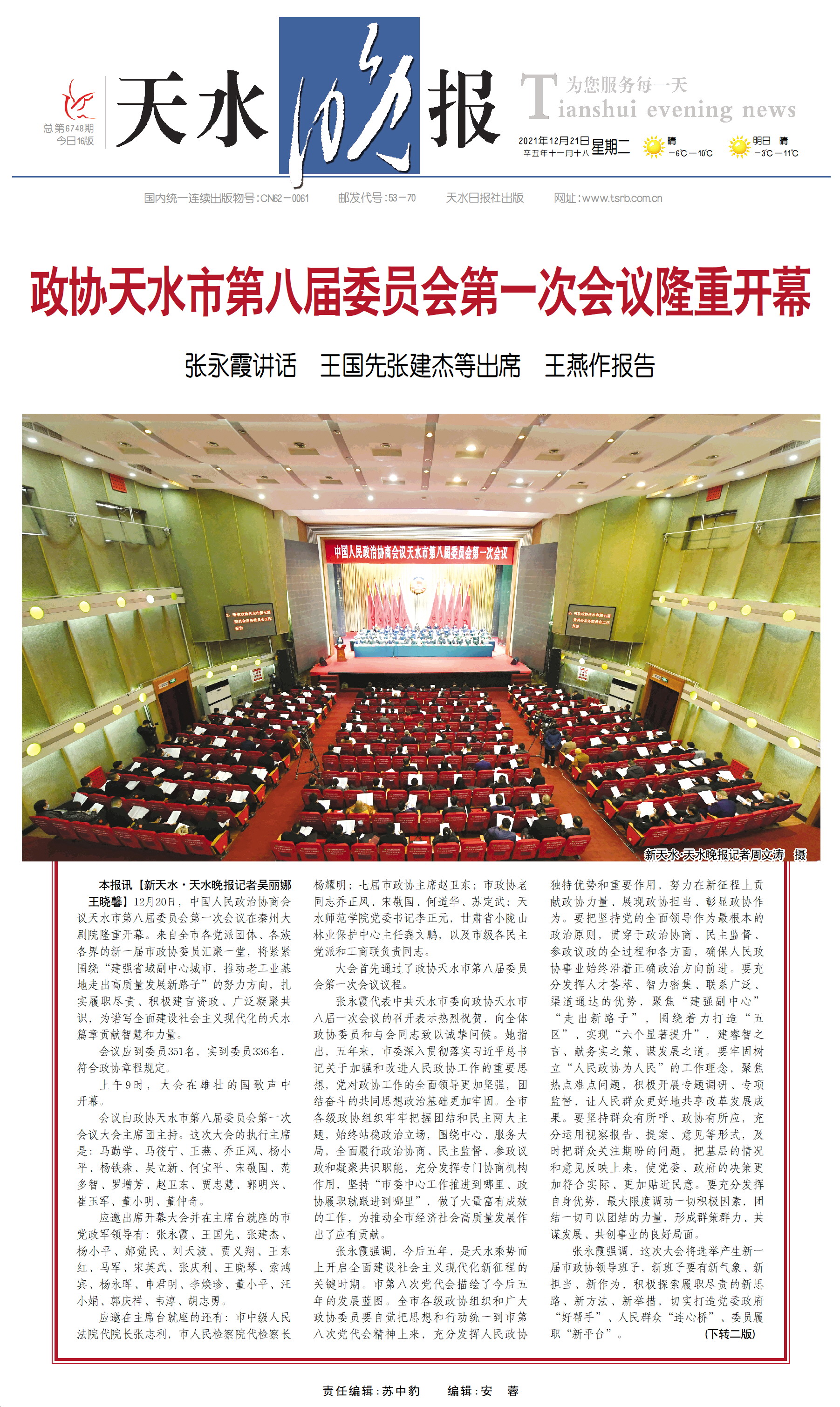 本报讯【新天水·天水晚报记者吴丽娜 王晓馨】12月20日,中国人民政治协商会议天水市第八届委员会第一次会议在秦州大剧院隆重开幕。来自全市各党派团体、各族各界的新一届市政协委员汇聚一堂,将紧紧围绕“建强省域副中心城市,推动老工业基地走出高质量发展新路子”的努力方向,扎实履职尽责、积极建言资政、广泛凝聚共识,为谱写全面建设社会主义现代化的天水篇章贡献智慧和力量。