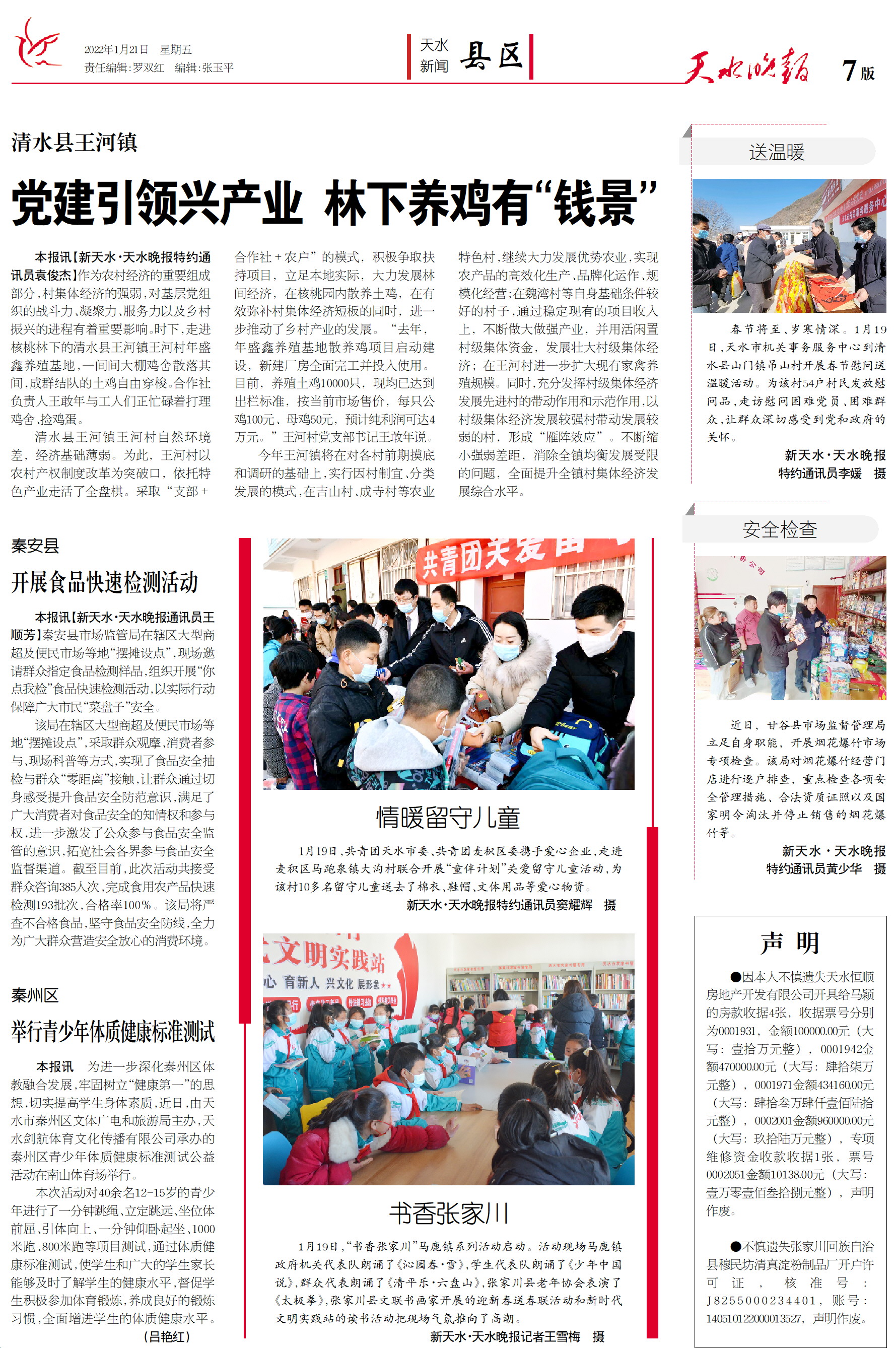 本报讯【新天水·天水晚报特约通讯员袁俊杰】作为农村经济的重要组成部分,村集体经济的强弱,对基层党组织的战斗力、凝聚力、服务力以及乡村振兴的进程有着重要影响。时下,走进核桃林下的清水县王河镇王河村年盛鑫养殖基地,一间间大棚鸡舍散落其间,成群结队的土鸡自由穿梭。合作社负责人王敢年与工人们正忙碌着打理鸡舍、捡鸡蛋。