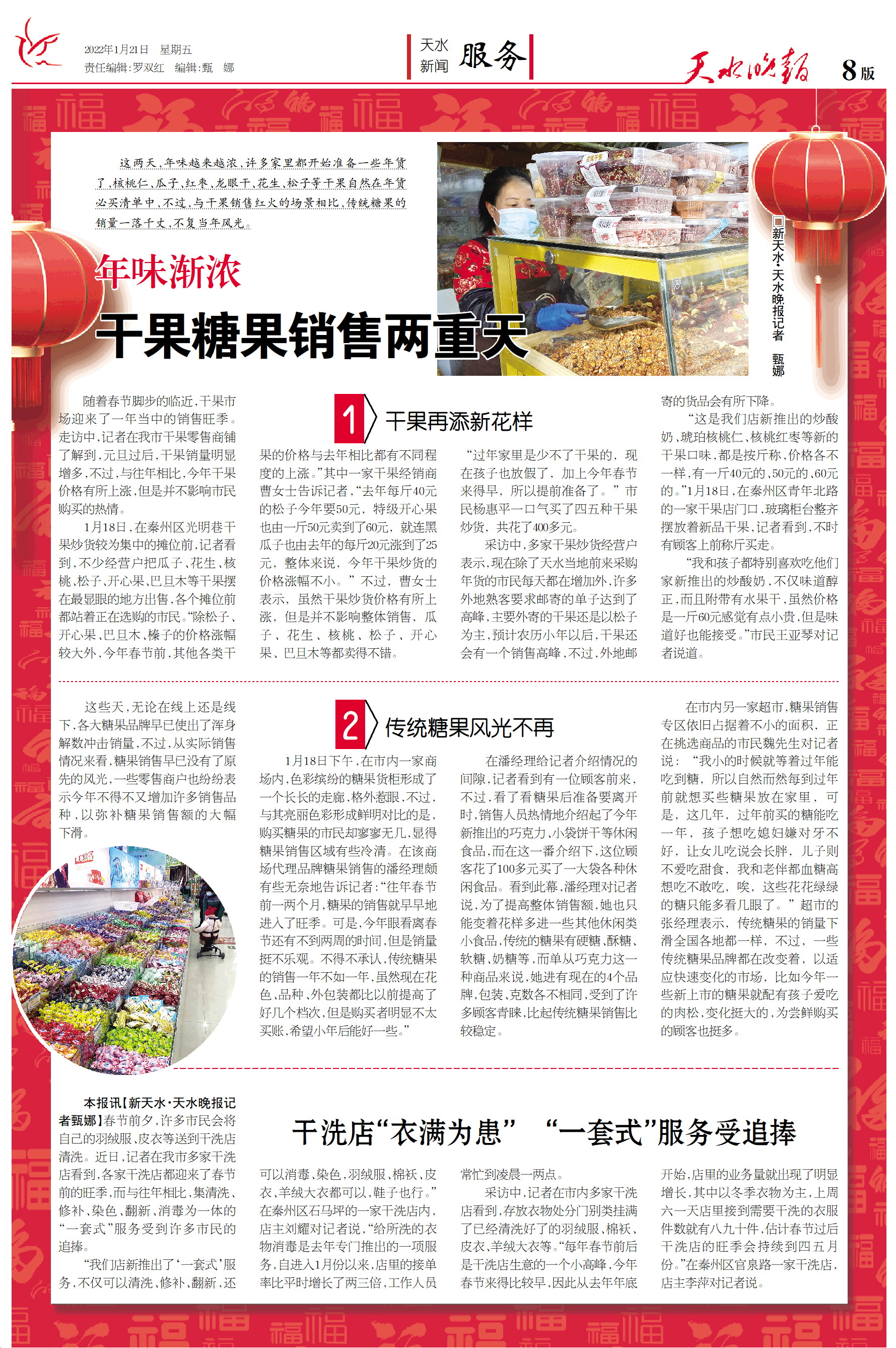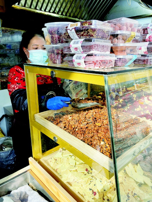 “这是我们店新推出的炒酸奶、琥珀核桃仁、核桃红枣等新的干果口味,都是按斤称,价格各不一样,有一斤40元的、50元的、60元的。”1月18日,在秦州区青年北路的一家干果店门口,玻璃柜台整齐摆放着新品干果,记者看到,不时有顾客上前称斤买走。