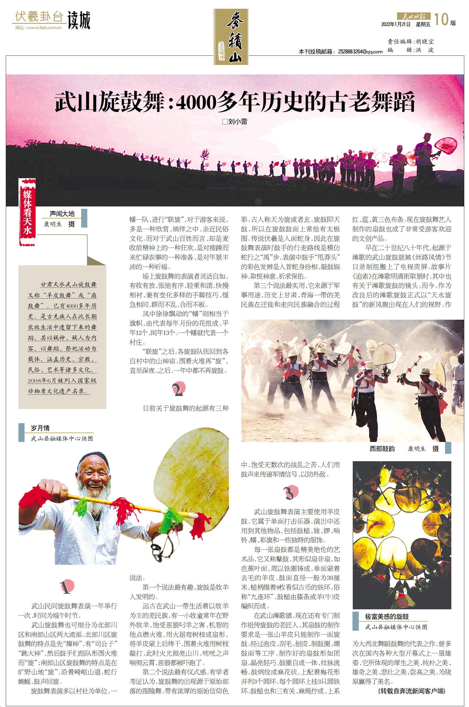 甘肃天水武山旋鼓舞又称“羊皮鼓舞”或“扇鼓舞”,已有4000多年历史,是古羌族人在此长期农牧生活中遗留下来的舞蹈,其以娱神、娱人为内容,以舞蹈、祭祀活动为载体,涵盖历史、宗教、民俗、艺术等诸多文化,2008年6月被列入国家级非物质文化遗产名录。